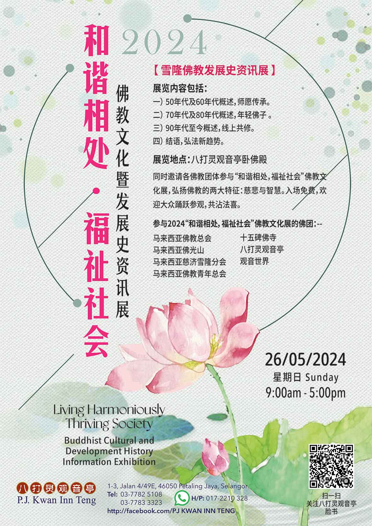 同时邀请各佛教团体参与“和谐相处,福祉社会”佛教文化展,弘扬佛教的两大特征:慈悲与智慧。入场免费,欢迎大众踊跃参观,共沾法喜。