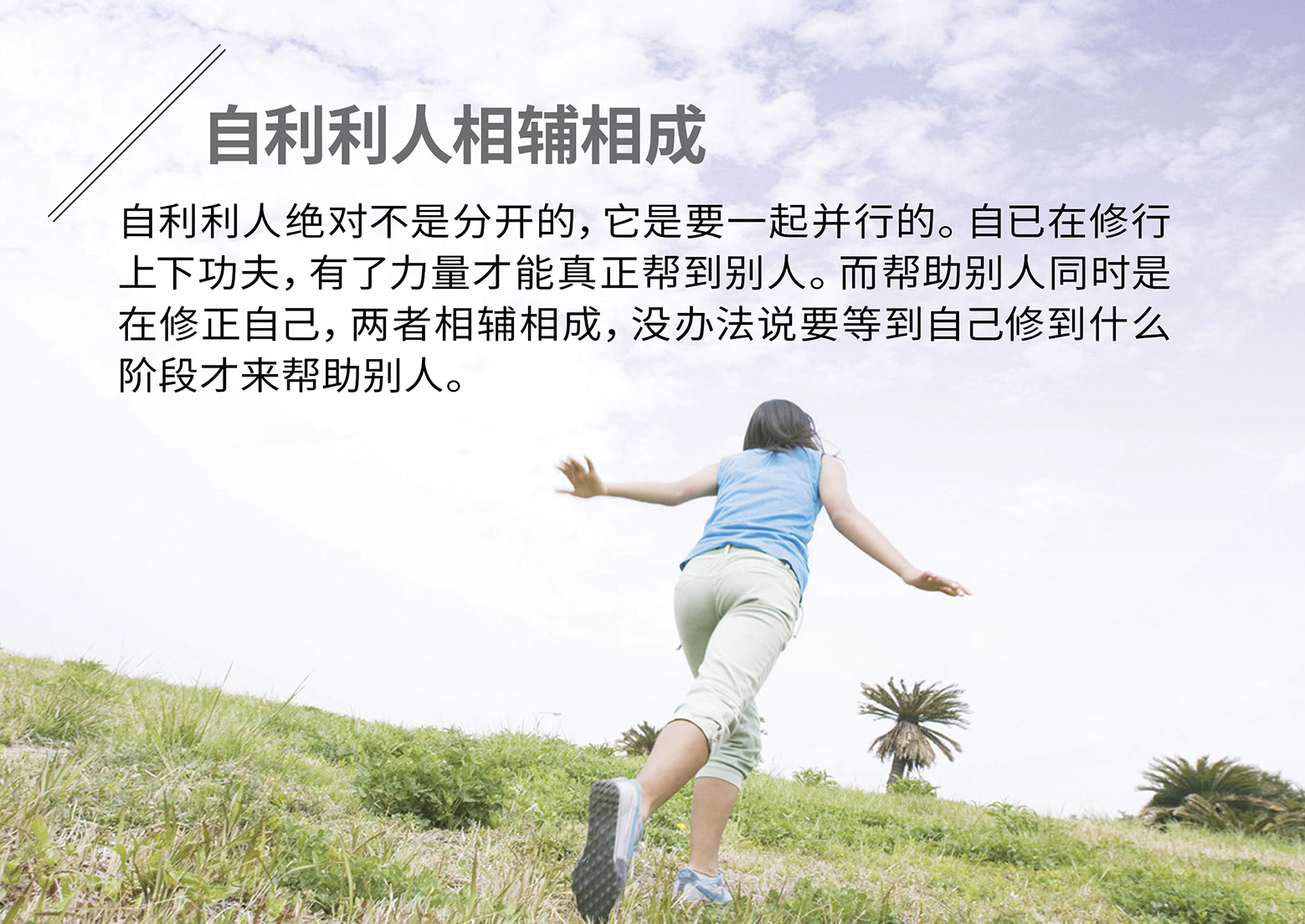 自利利人绝对不是分开的,它是要一起并行的。自已在修行上下功夫,有了力量才能真正帮到别人。而帮助别人同时是在修正自己,两者相辅相成,没办法说要等到自己修到什么阶段才来帮助别人。自己看不到自己这么多,而是需要透过人与人之间互动、相处才能更了解:原来我们的心是这么容易有反应、是这么容易的不安定。所以对我来说,保持正念,时刻活在当下的方法,就能解决生活中一切的问题。