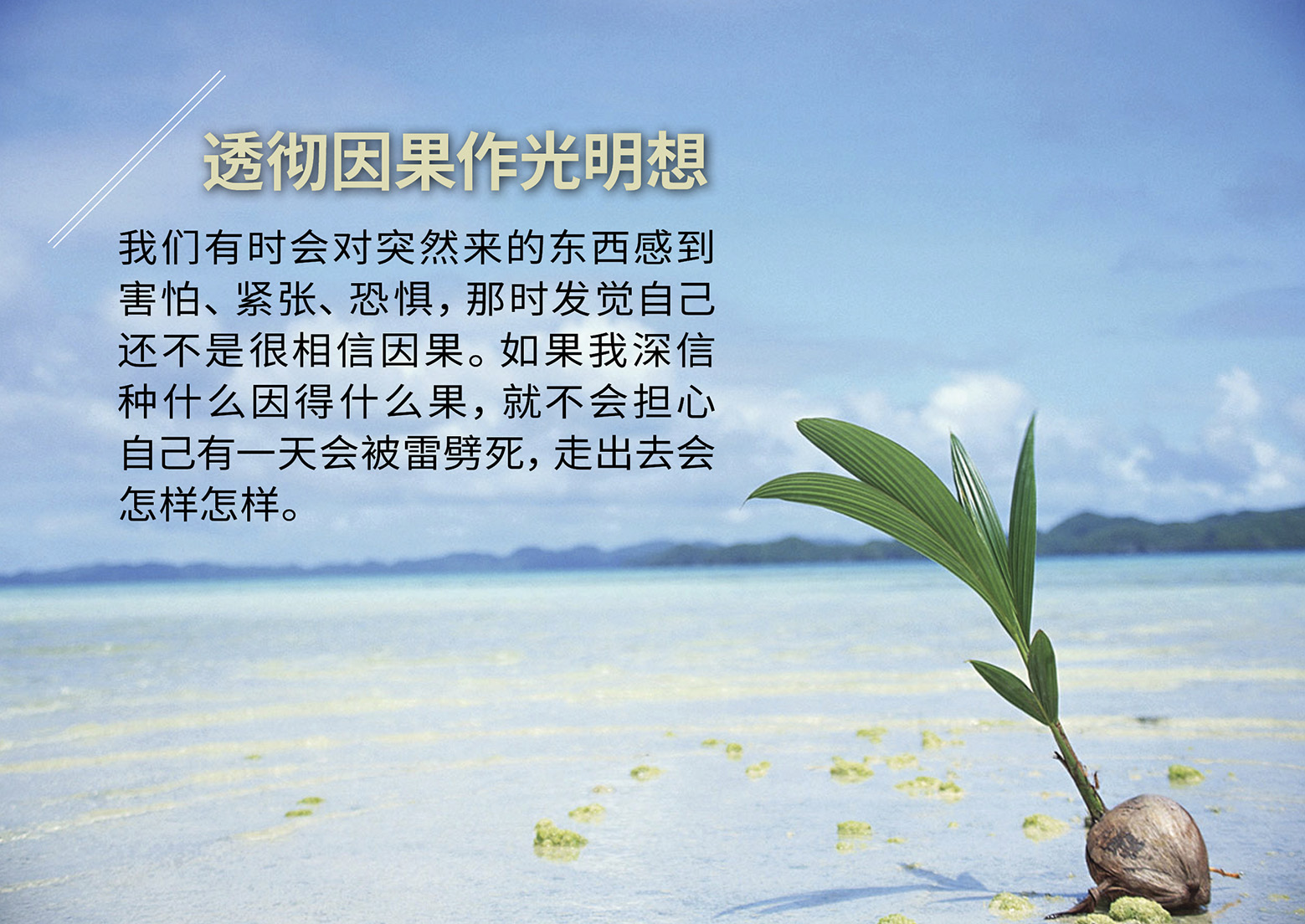 常:一切还是要回到身心世界转化。只要透彻因果,对任何事倩绝对不会感到担心。我们有时会对突然来的东西感到害怕、紧张、恐惧,那时发觉自己还不是很相信因果。如果我深信种什么因得什么果,就不会担心自己有一天会被雷劈死,走出去会怎样怎样。
