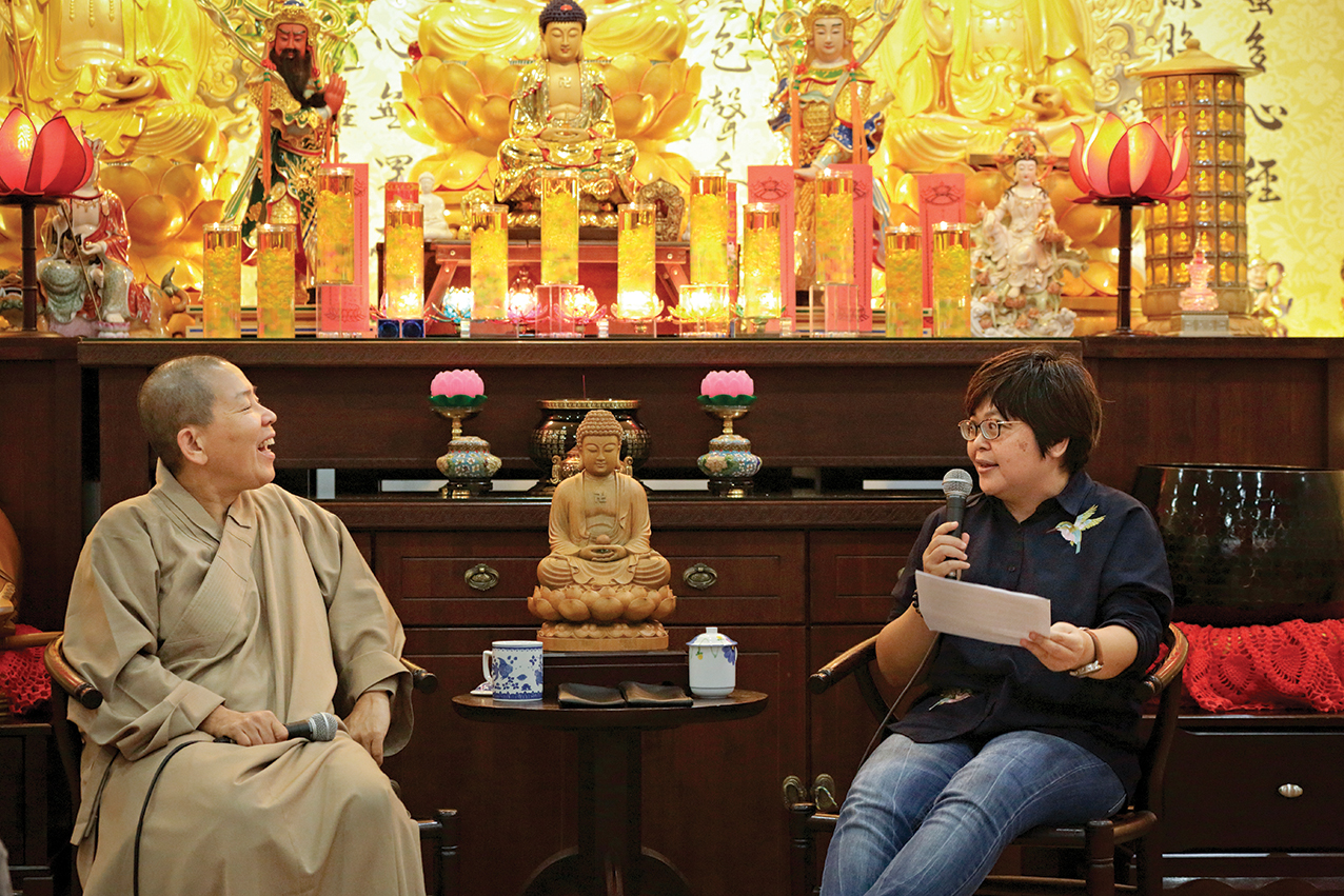 答:谢谢谢谢,我觉得你们让我年轻,我常常把你们放在我心里,常常觉得非常感恩,温暖我,现在看起来还年轻,是要谢谢你们,我把你们放在我心里,表示我没有了,你就是我。过去几年我常说的一句话,我们不是做好事就好。要谅解别人做坏事,你不谅解别人为什么要这么做,你会烦烦恼恼。对我来说你们就像一张白纸,我谅解你为什么要这么做,你为什么不能那么做。所以我不是在审判你,我是从你的心来看你的心,不是用我的心在看你,用我的心就会自以为是,我觉得学佛真好,很多人说诸恶莫作,众善奉行,奉行是不够的。你做了会觉得了不起,你看人家没有做,你看这个人不如法,你在起烦恼,要扮演神,要去教训人,如果可以用众生的因缘来看众生,就不会心虚。