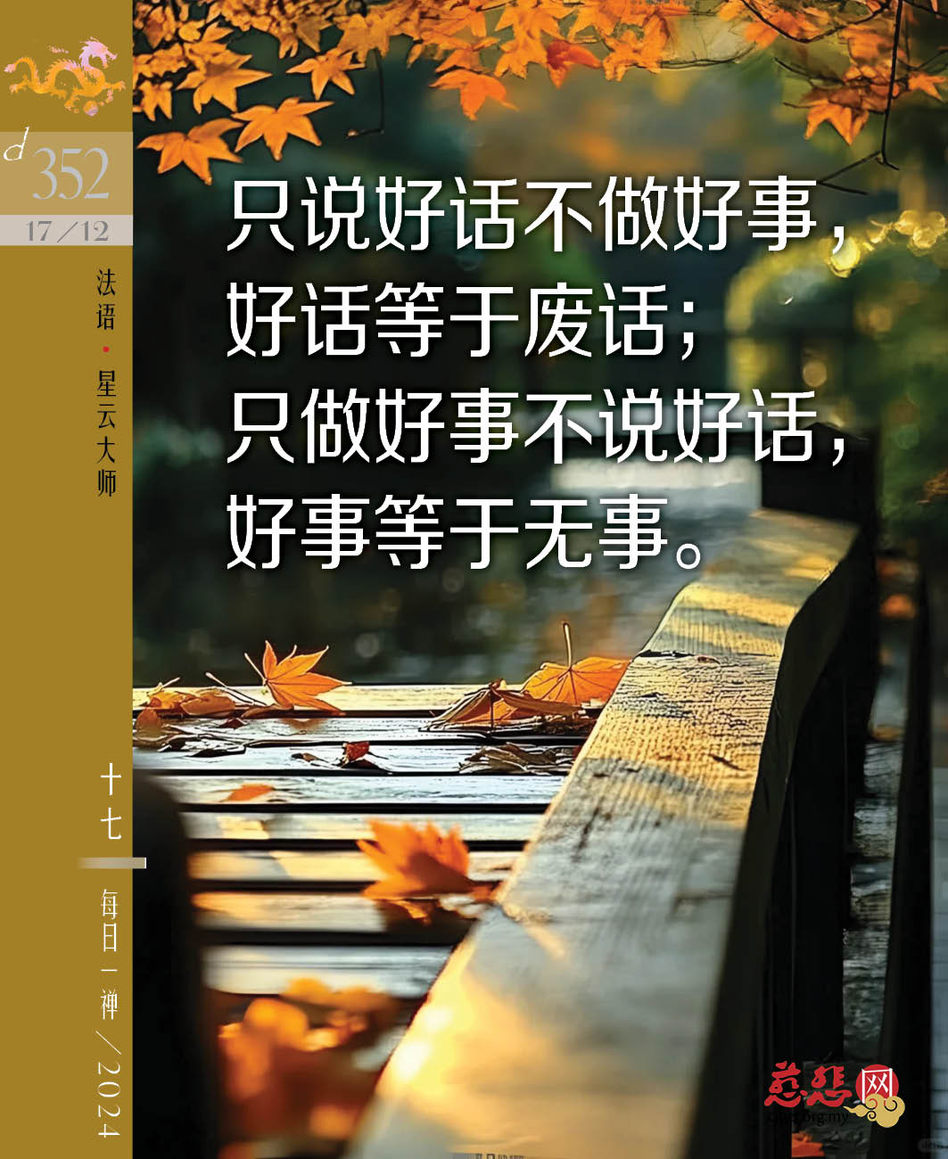 忙就是营养;要争气,不要生气;多说OK,少说NO;感动就是佛心;疾病就是良药;拒绝要有代替;立场互换;给人利用才有价值;自己就是自己的贵人;有钱是福报,用钱才是智慧;宁可失去一切,但不能没有慈悲。——星云大师