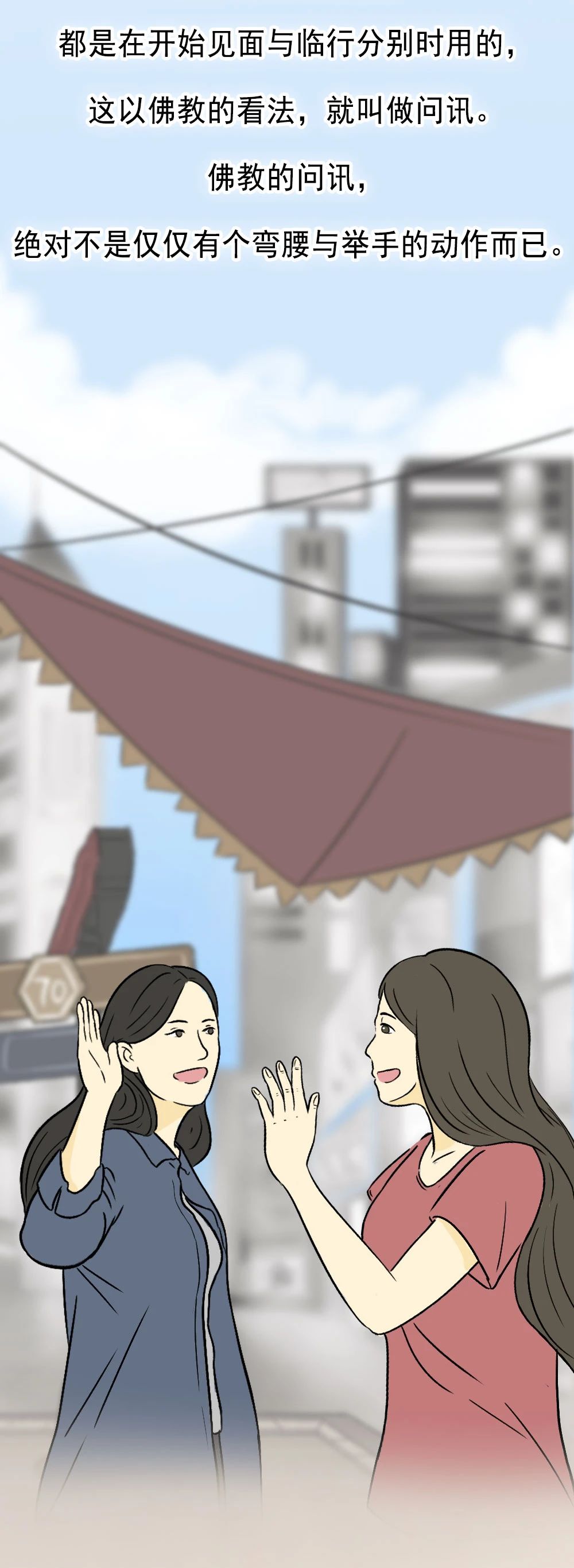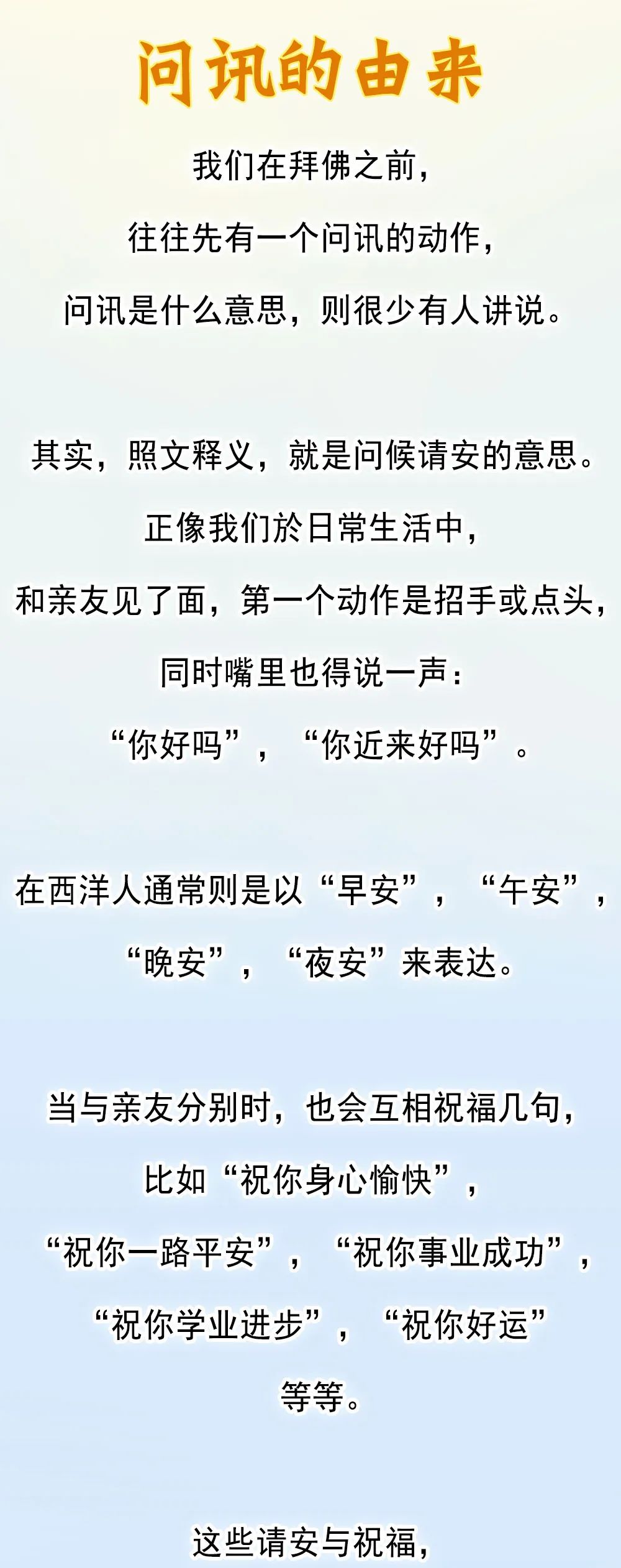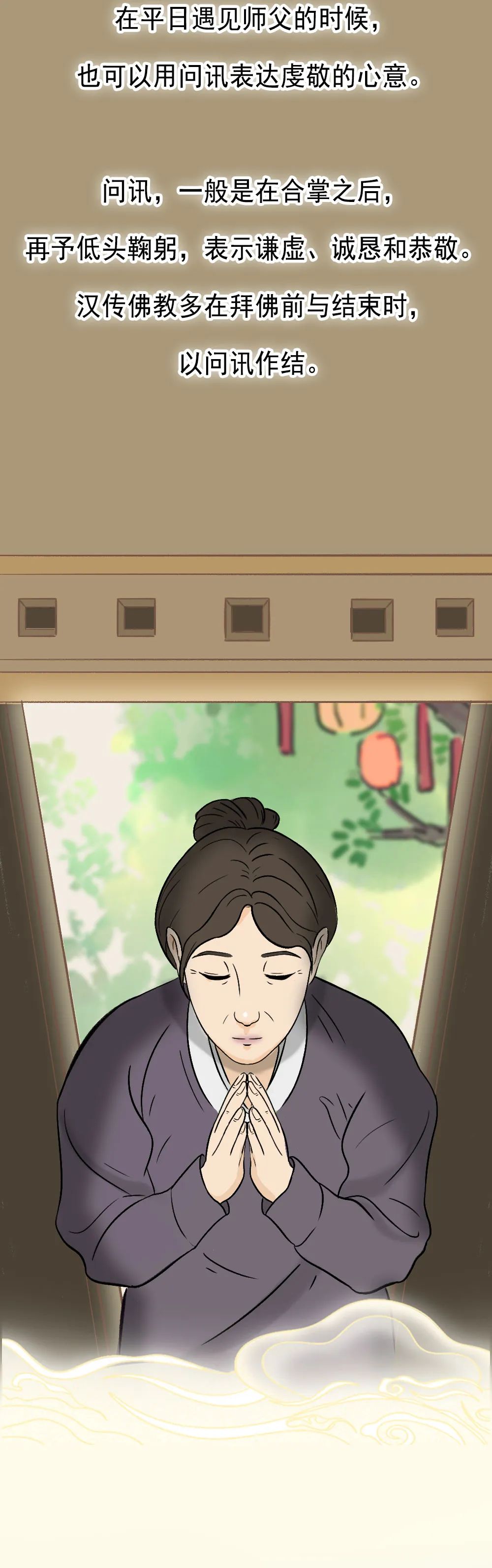“问讯”即是问候、请安的意思。是佛门中常用的礼节。所以也可以用问讯的方式跟诸佛菩萨顶礼。在平日遇见师父的时候,也可以用问讯表达虔敬的心意。