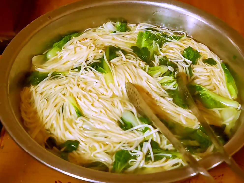 我也十分钟情于面食,学生时代中午只有我跟母亲两人用餐,母亲图方便都煮面,我总吃得盘底朝天,于是母亲不断加量,我终入忍不住跟母亲抗议,肚子都撑涨了,母亲笑嘻嘻责备::憨囝仔,吃不完不会剩下呀!”母亲煮的面每次不同,有什么料随意放,少有同样的味道,连分量都没有标准化作业程序,却独一无二创造出那种属于母亲特有约好滋味,外出工作嘴馋时也会模仿煮来吃,却总少那么一味。母亲茹素之后总不舍母亲料理荤食,换我煮一碗胡椒酱油面给母亲吃吧。