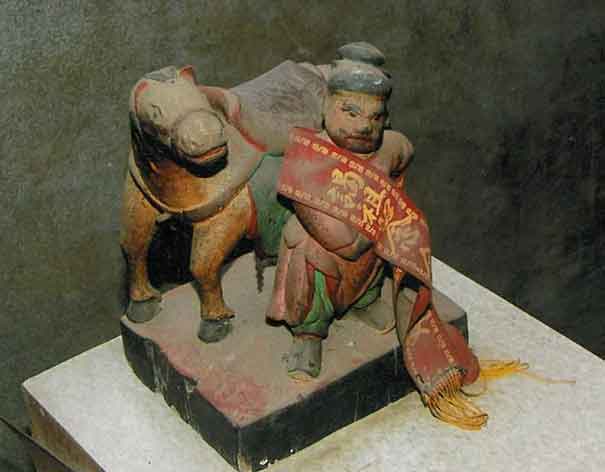 台湾西部沿海居民王爷信仰十分普遍,○○府千岁庙林立,既然是武庙,兵马营是重要配置,像关帝庙多配置赤兔马、马僮,一般王爷庙正殿或偏殿,常见与真实人物等比大小的马与马僮雕塑。一日来到一个人口不多的的小村,村口一间庙,工作之暇,信步入殿参访一番,雕梁画栋寻常不过,忽地看见高大的马与马僮座下方,摆放着一组迷你版的马与马僮,仔细一瞧却打从心底发出会心的微笑来。