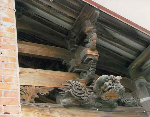 匆匆交待妥工作,立刻变身超人,前去拯救阿伯,位于辖区最边边,倒是花了点功夫才找到阿伯家,一看很完整的三合院格局,水泥砖造壁墙,梁木却是木造建筑,依往常经验推估年代约70年左右,阿伯大喇喇的抓了张椅子在堂前坐下,专程等我这个救星到来,心中盘算要如何启齿公事公办,不料阿伯看见我,兴奋地从椅子上跳下来,超热情的欢迎,让我受宠若惊,待招呼坐定,话匣子一开竟然天南地北聊不停,谈起这栋房房子落成时他才3岁,这栋古厝屋龄正满70,他津津乐道光这一扇门从选料、曝晒、上漆等层层工法、到完成要3个月,算算工钱就不得了,随即引导我前往正厅参观,随着他手指处,才发现全是精雕细琢的木造装饰,厅堂方正摆设典雅,虽有岁月的痕迹,却不掩其富丽风光旧貌,与初见时感觉寻常一般大相迳庭,真是有眼不识泰山,最引人注目的是堂前柱上的一对木雕狮子,栩栩如生盘据门前,勇猛无比威风凛凛的守护着这栋古厝,任凭风吹雨打,却依然屹立,只见须上有泛白的渍痕,倒显现出一股白髯飘飘的古意。
