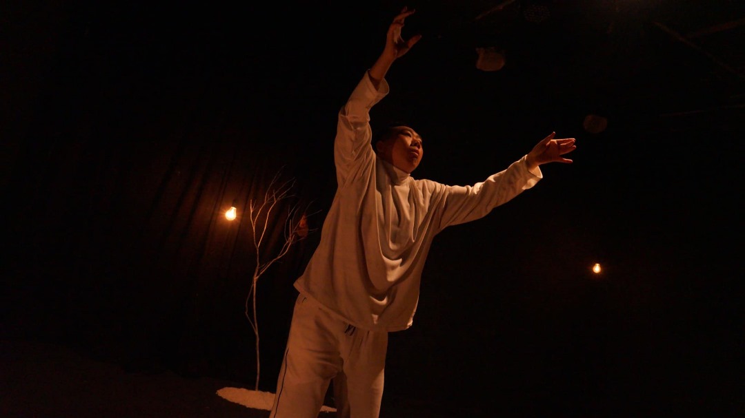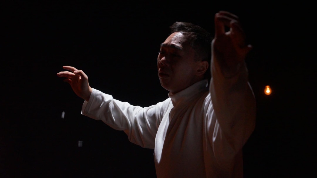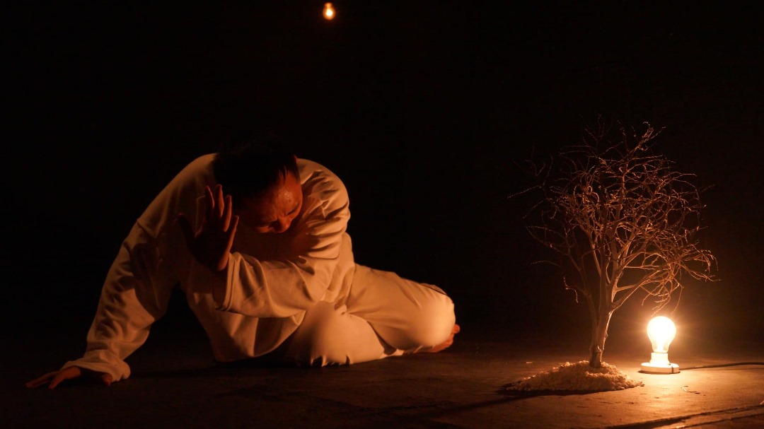小男孩仿佛在与爷爷对话,或回忆爷爷病逝的场景。两人似乎都困在一具找不到出口的躯体里,演员呈现了无限焦虑与无比痛苦的肌体动作。那接近哀伤绝望的扭曲表情,深深吸引住我的视线,也牵动我的思绪。我超专注的“凝视”演员的每个动作与神态,甚至其脸上的汗珠。演员的那份焦虑不安,仿佛也反映了我那时的内心境况。