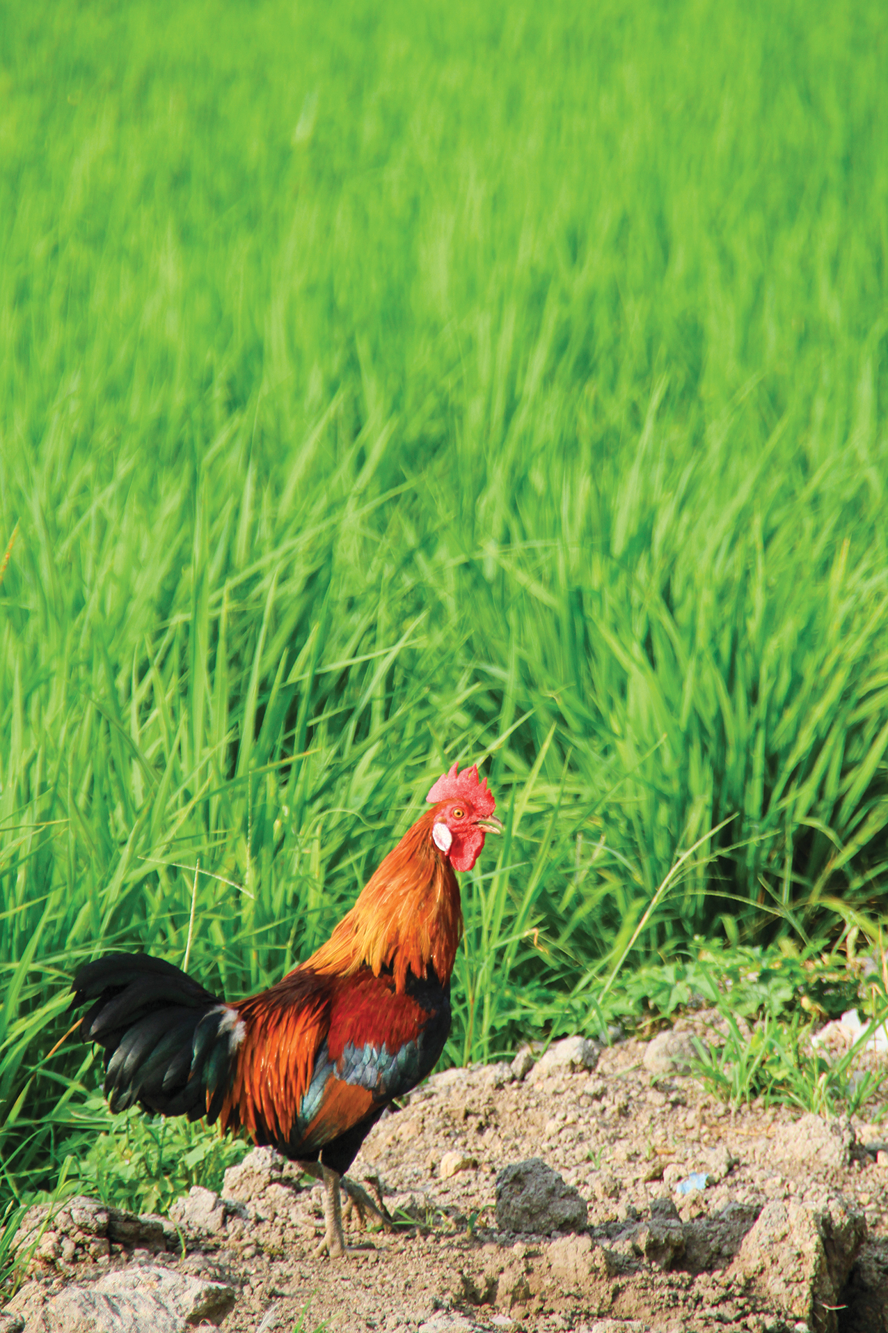 万绿丛中,却出现了一只公鸡,每天在屋后树丛间悠闲的啄食沙粒。