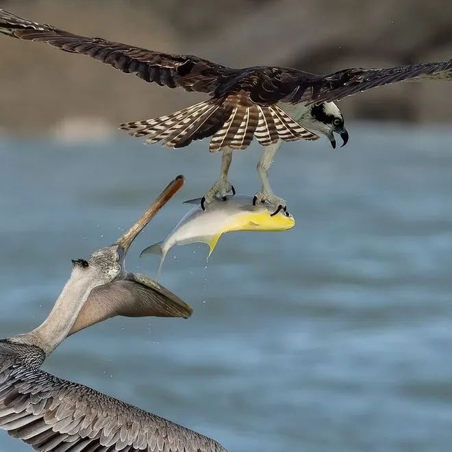 ▲ 一只鱼鹰从鹈鹕嘴里抢走鱼的瞬间,嘴边的鱼就这么飞走了,这鹈鹕也太惨了。