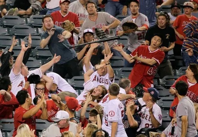 ▲ 当一根球棒突然飞到观众席的抓拍,每个观众的反应都可以当作表情包了。