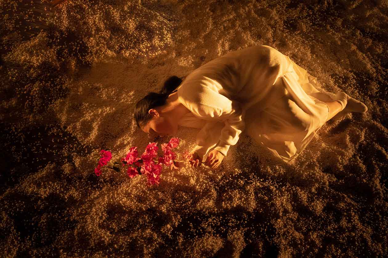 我以演员为针,以画面与音乐为线,编织成一个又一个的瞬间,于是有了《暗恋》(2001)里七个捧着碗的演员同时旋转,水花四溅的场面;《天黑以后,天亮以前》(2011)洁白枯树上皑皑白雪缓缓飘落;《甲虫の梦》(2022)里三个演员以身体组合成树的形状,戴着白色面具的男子撑着伞骨缓缓走过;《房间二》(2023)演员化身成树,缓慢自转的同时白花细碎落下覆盖他一身。