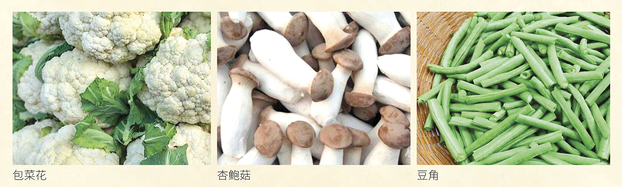 2)烧热1 ½大匙油爆香姜末,加入豆角炒至翠绿,加入杏鲍菇炒香,再加入包菜花粒、豆干碎及什豆大火快炒,最后加调味料炒香上碟。