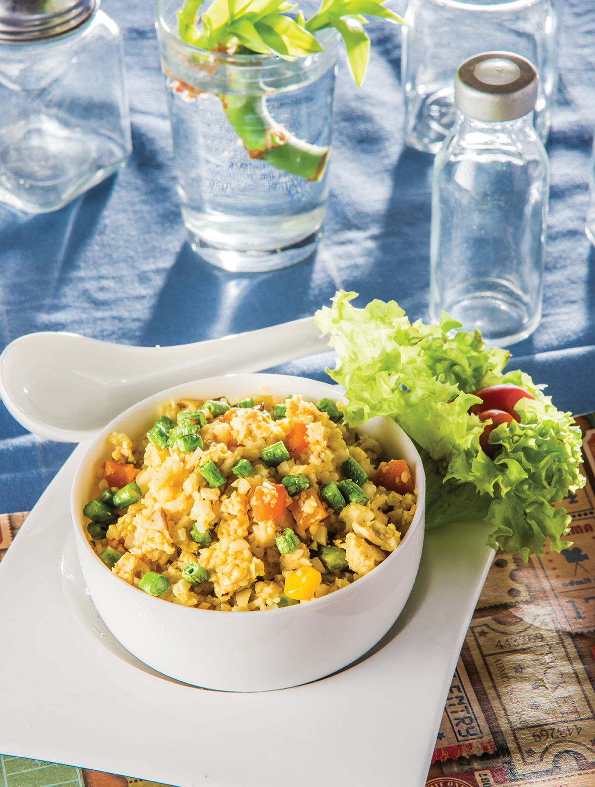 1.Cut cauliflower finely into the shape of rice. Blanch and drain, set aside.