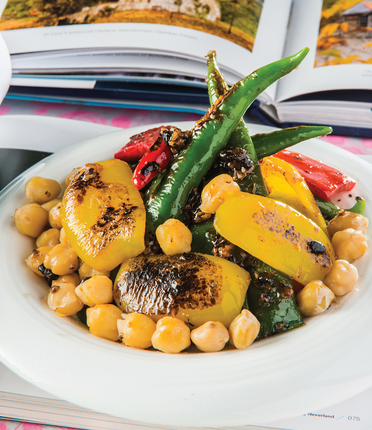 2. 材料(A)—青辣椒和甜椒白鑊以大火煎至外皮焦黄即可盛起。