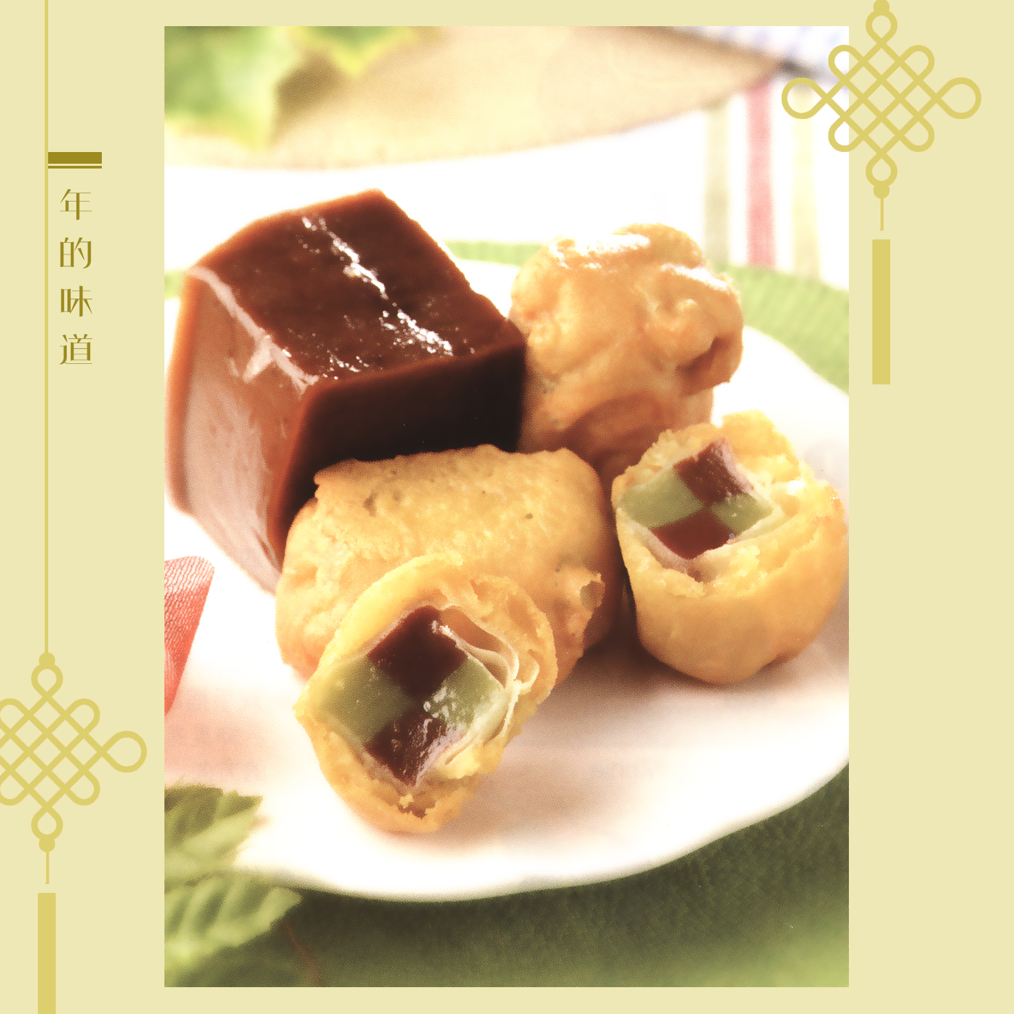 nge the chocolate and pandan new year cake strips alternately in two layers and cut into small squares. Used the chilled spring roll skin to wrap the square cakes and seal with batter. Dip in Deep Frying Batter ingredient (D) to fry until golden, then serve.
