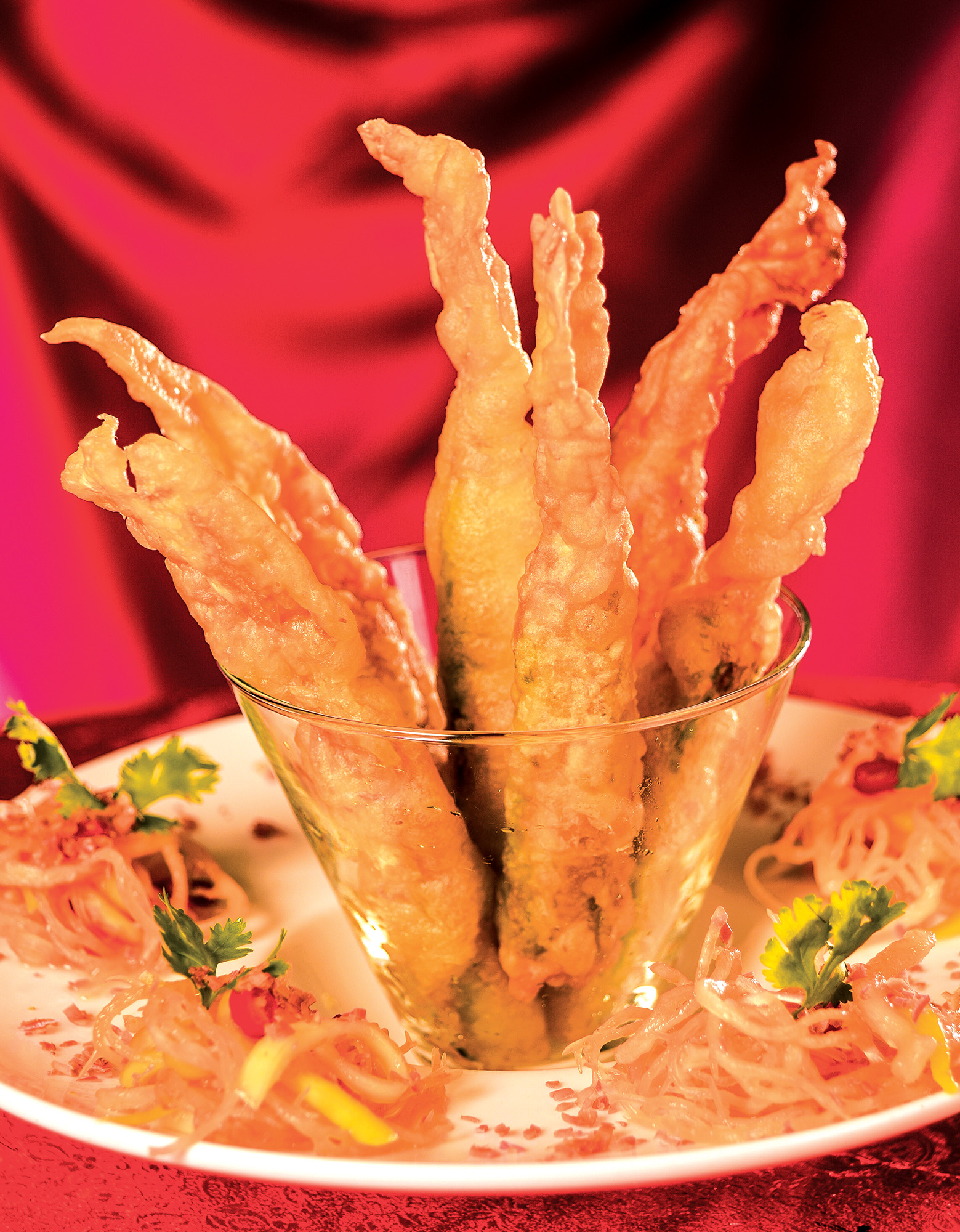 2. Put 1 pc each of ingredients (B) on top of spring roll skin roll up and seal with batter. And then twist both ends into the shape of Veg. prawn. Dip into batter and fry until crispy. Serve with chilli sauce while hot.