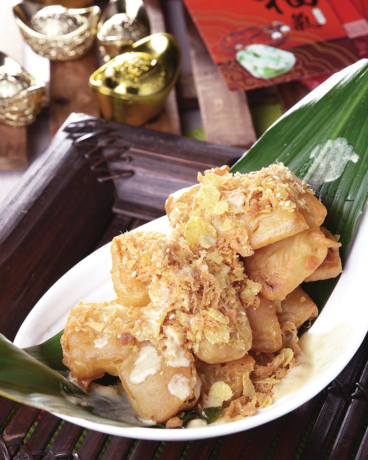 Crispy cornflakes and bean floss coated pumpkin