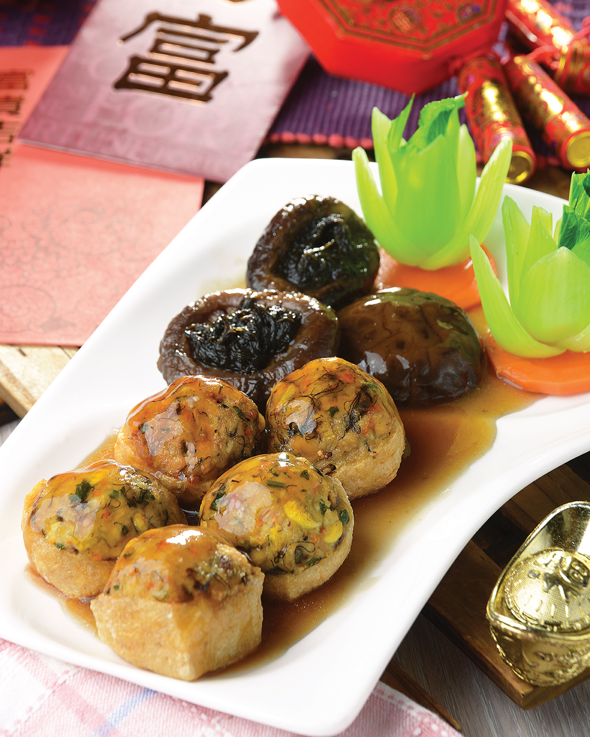 4. 取适量做法(3)馅料酿入做法(1)之半粒豆腐卜(先搽生粉)。重复至酿完全部豆腐卜。将酿好之圆满球放入蒸锅蒸5分钟,待凉以油煎一下,备用。