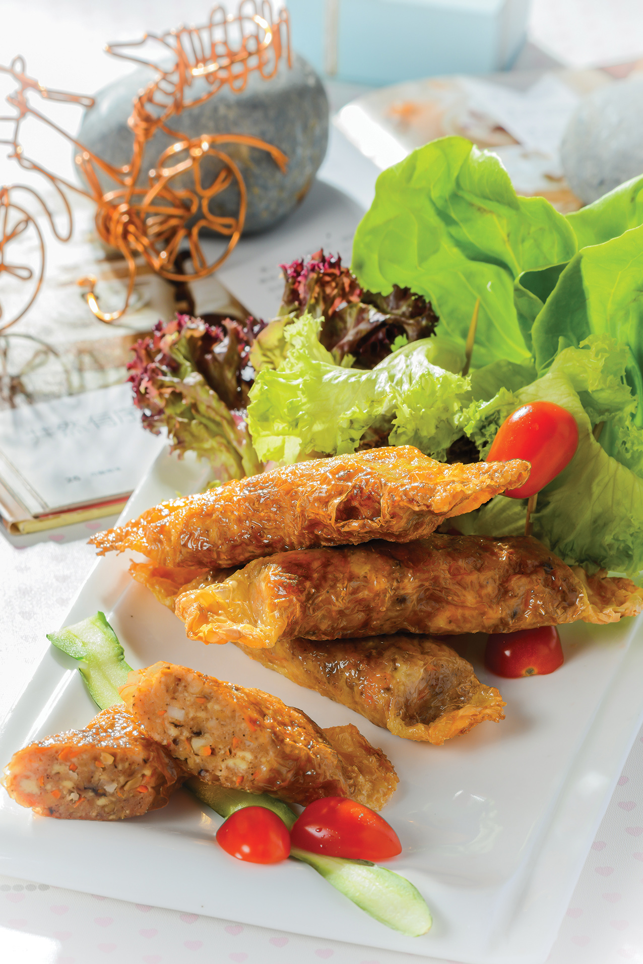 4. Place the right amount of filling on each bean curd sheet, and roll it up. Seal both ends with batter (mixture of flour and water).