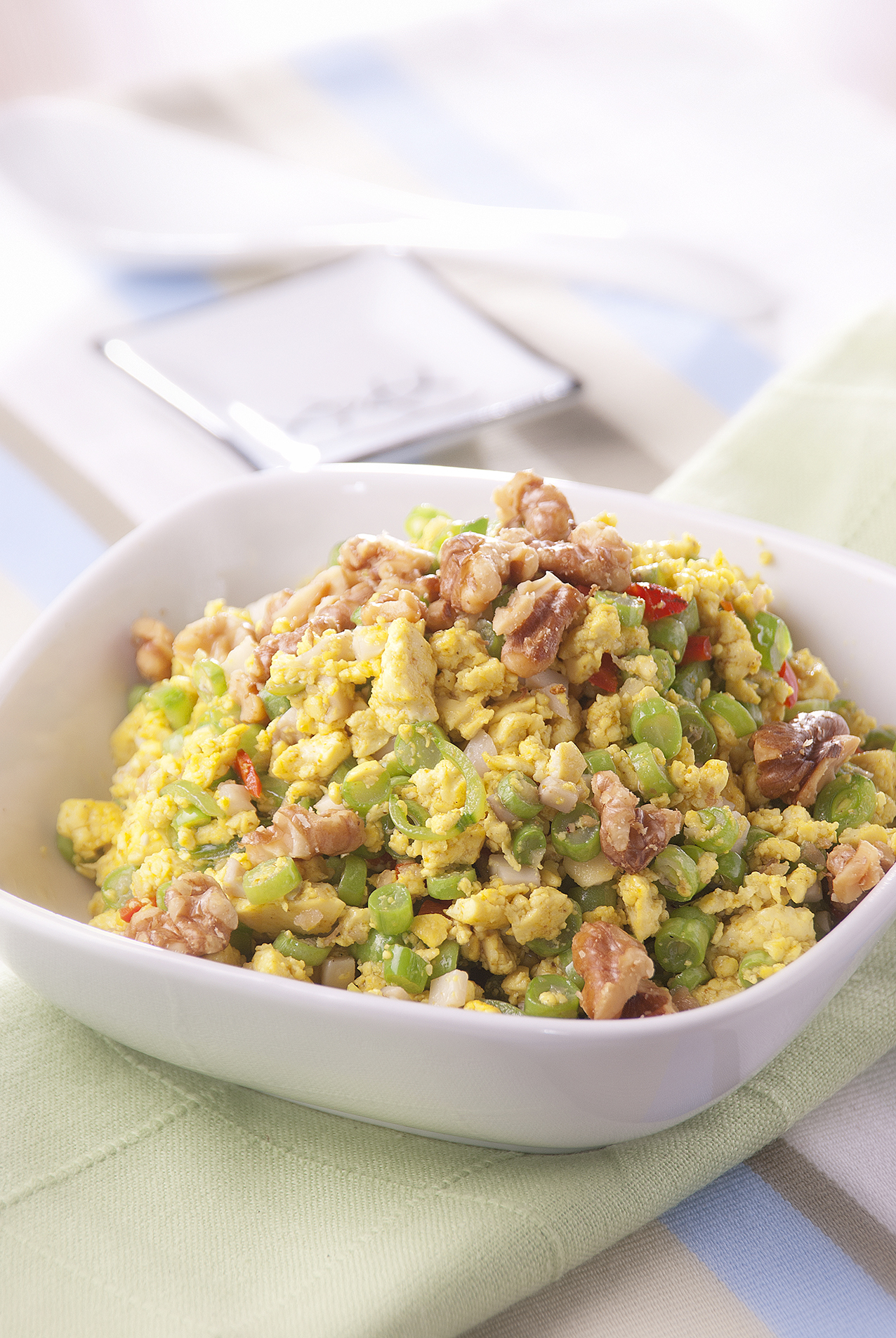 2. 咖哩粉、素G粉、盐、胡椒粉倒入已搓烂的白豆干,拌匀后倒入热锅(不用放油),炒至水份稍干及松散,盛起。