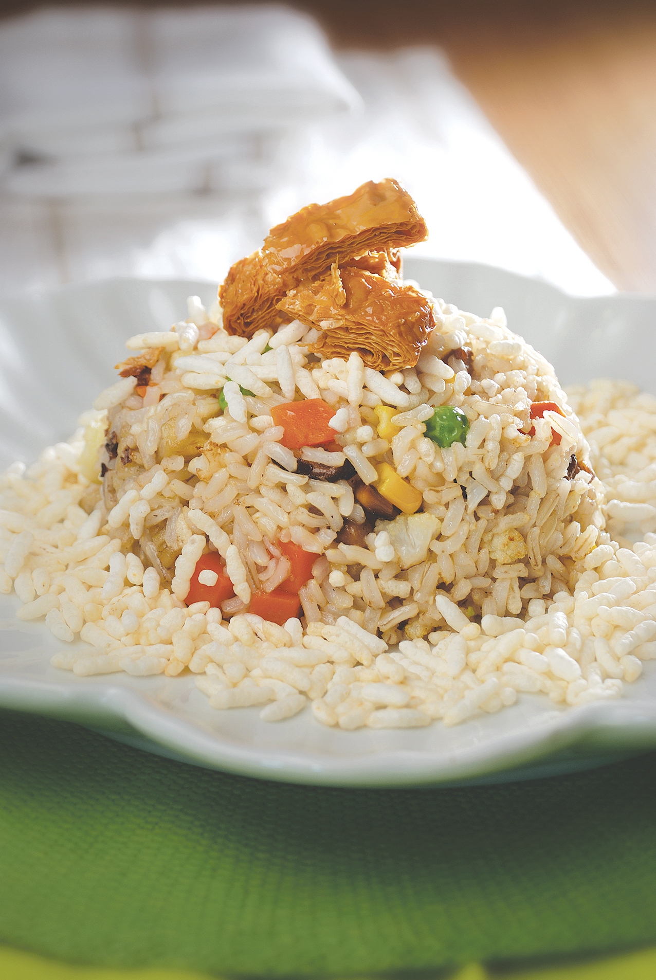 3. 盛起,在饭面撒上素咸鱼及脆米,趁热享用。