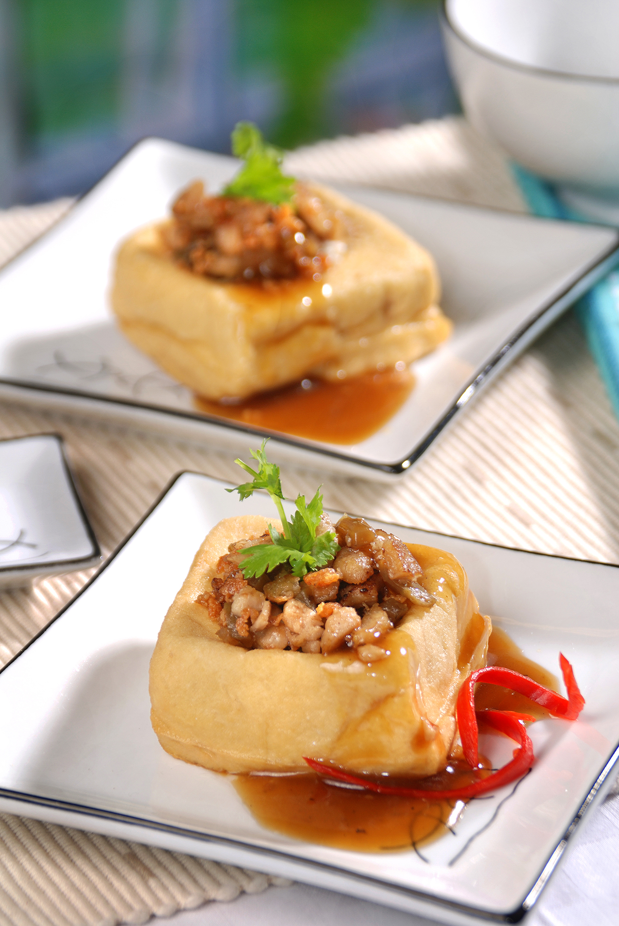 1. 将生花豆腐炸至金黄色,上碟。在每块豆腐中间挖一个洞,备用。