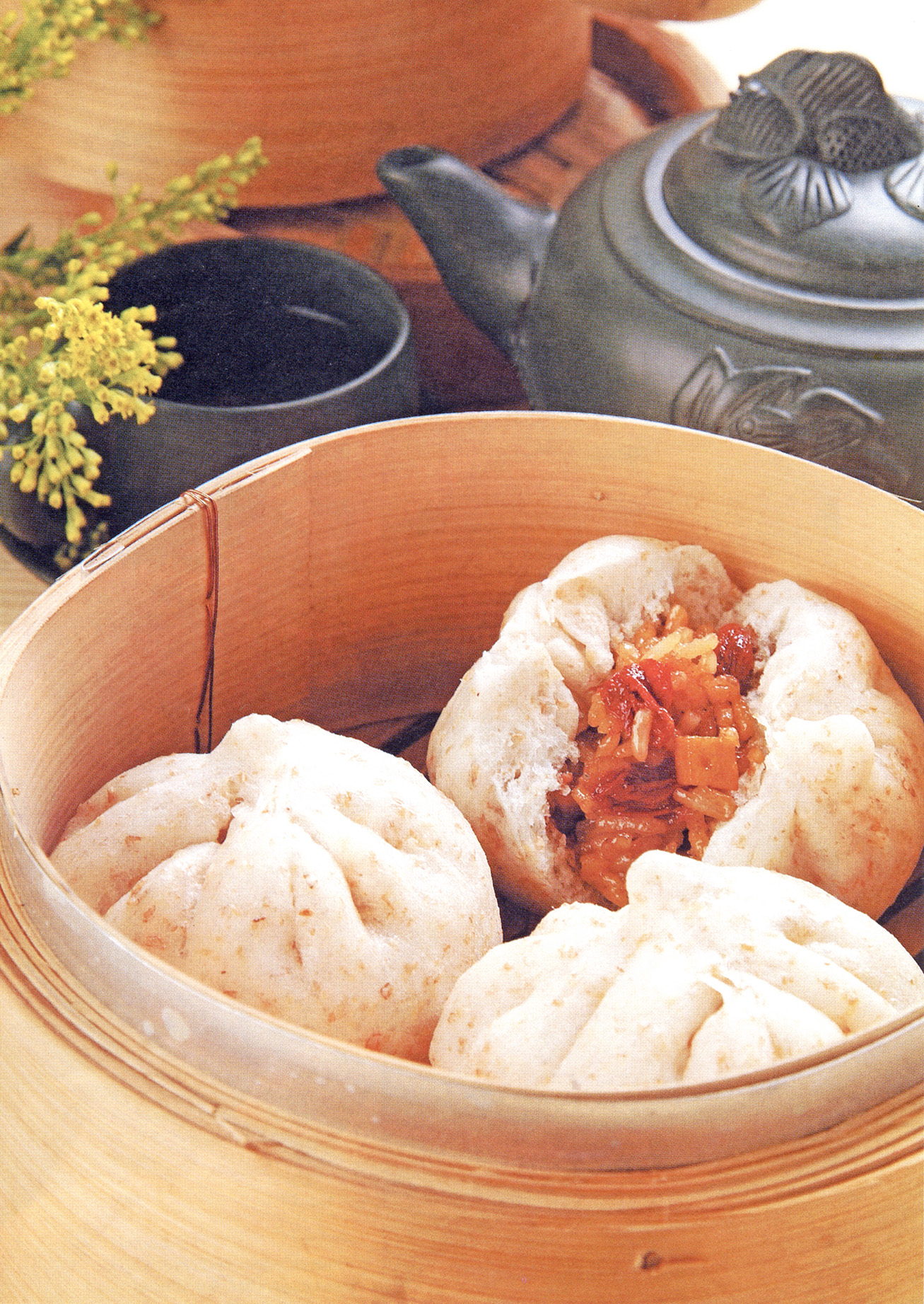 Mix ingredients (B) well and leave aside for 5-8 minutes. Mixed (A) well and make a well in the middle and add in (B) and (C). Mix well and add in (D). Knead into a dough and divide into 12 portions. Roll into ball and leave aside for 10 minutes. Roll flat and add in filling and shape into a bun. Leave aside for 30 minutes to rise. Steam under high fire for 5 minutes.