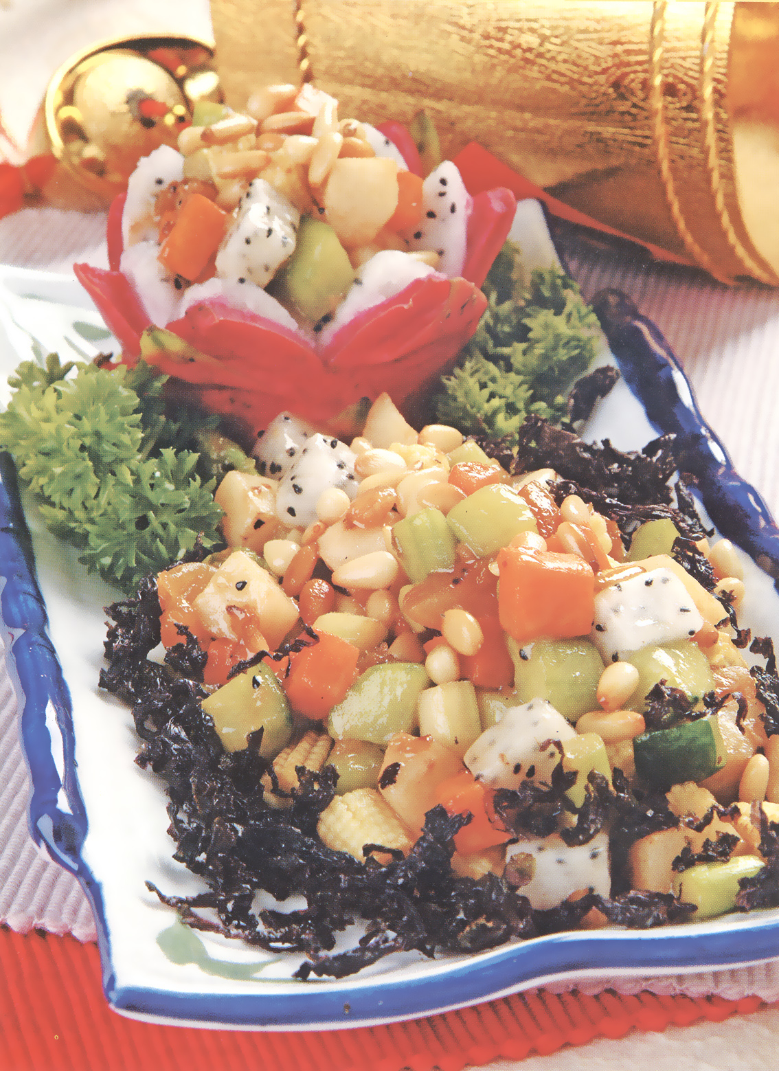 Cut all ingredients 1 into cubes. Blanched ingredients 2 in hot oil. Remove from oil, saute ingredients 4. Add in ingredients 1 and 2 together with seasoning. Dish out and garnish with fried pine nuts.