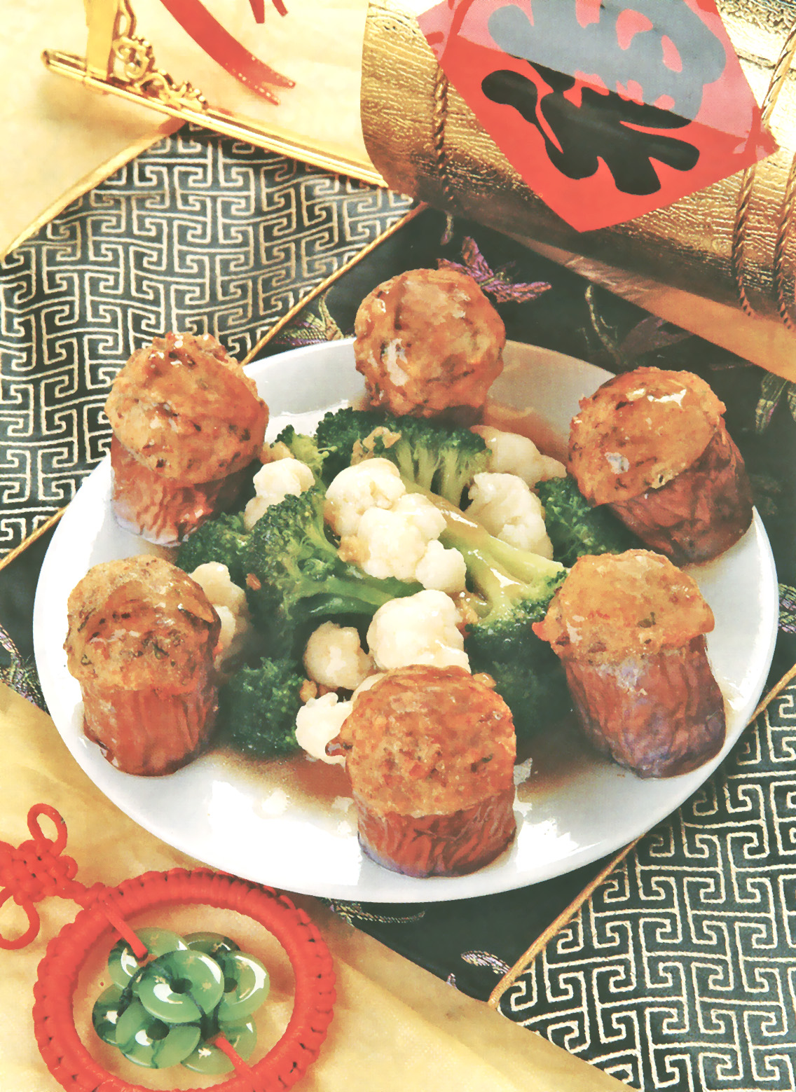 3 Cut brinjal into 1 inch lengthwise. Dig a well in the middle of the brinjal and stuff with the “Flower Bouquet Filling”. Deep fry the brinjals till golden brown and steam them for 5 minutes. Pour sauce over the brinjal and arrange the cooked broccoli and cauliflower beside them.