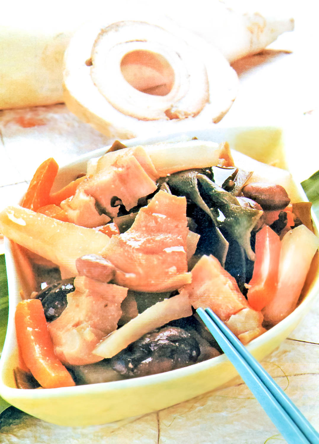 2. 烧热2大匙油、爆香姜末炒香(B)料,加入3 1/2杯水,煮约15分钟,再加(A)料和(D)料,煮片刻即可熄火,最后加入(C)调味料即成。