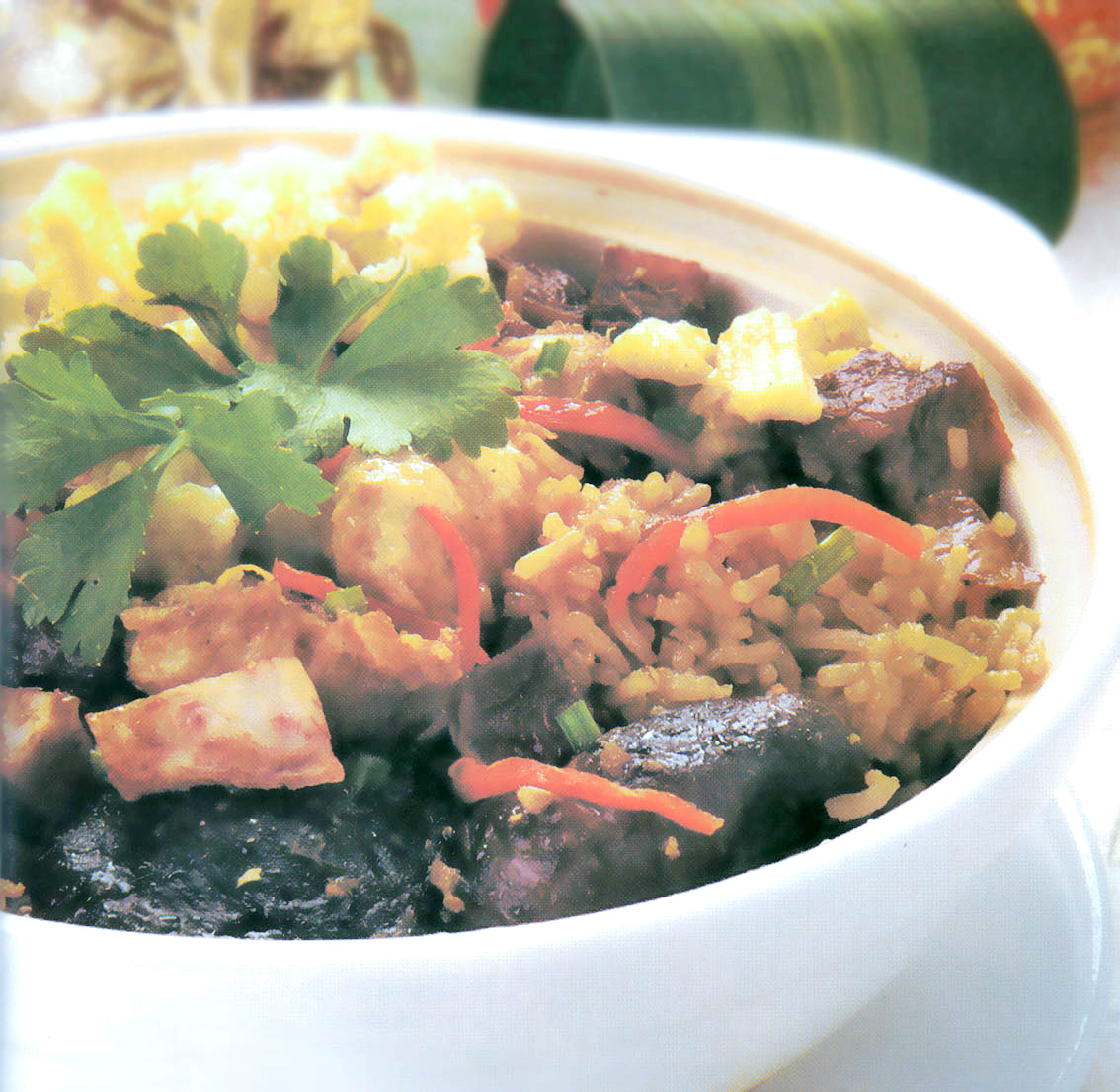 2. (A) 料用瓦煲煮至差不多要干水,加入(C)料再加 (B) 料,盖住再煮5分钟,慢火焗至饭熟,享用时加入 (E) 料即成。