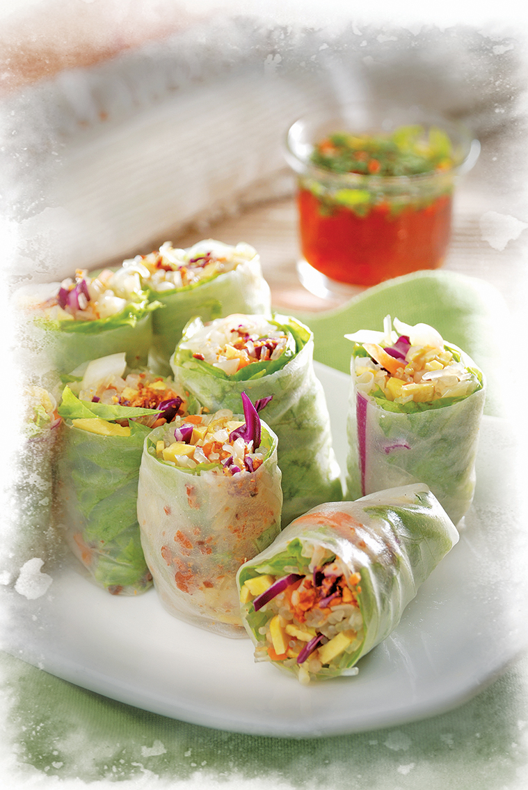 5. 取1片越南薄饼皮,浸到水中至软身,快速拿起。铺上1片生菜和适量的馅料,再加入少许材料2.,卷起包好。