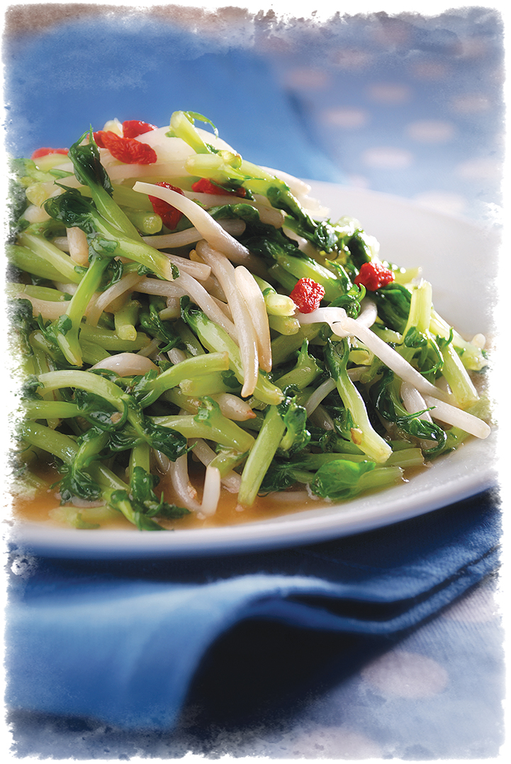 2.烧热适量油,先把姜茸爆香,加入豆苗快速清炒,目的是去除豆青味。