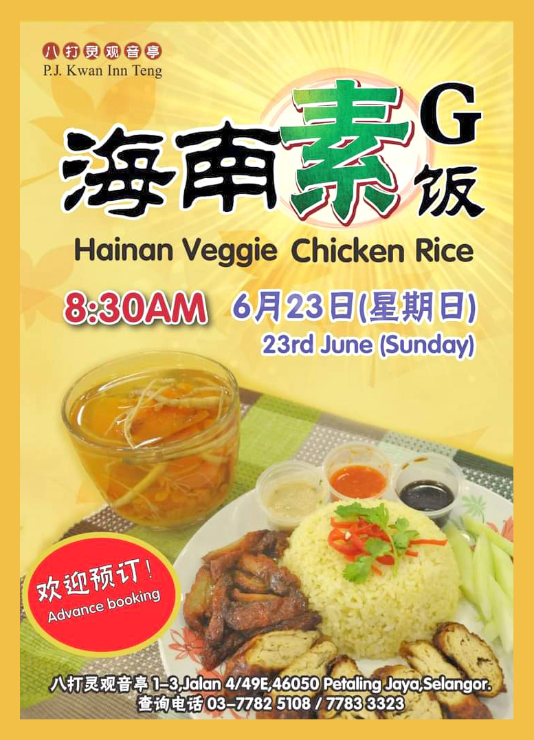 PJ Kwan Inn Teng will start selling Hainanese Vegetarian Chicken Rice at 8:30am-11:00am on 23 June (Sun). The public is welcome to taste and purchase this delicious meal. Pre-order reservations are now open to ensure availability!