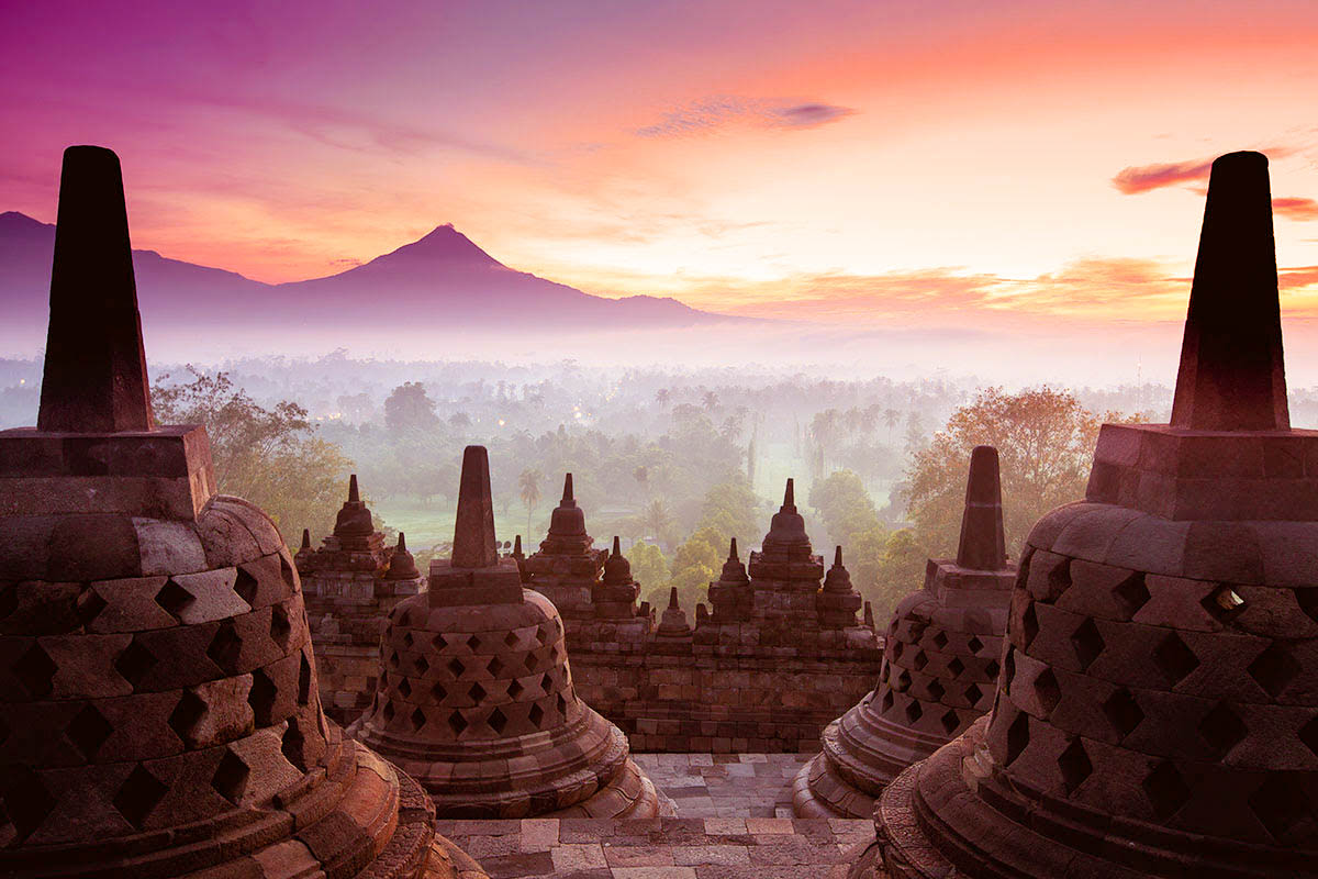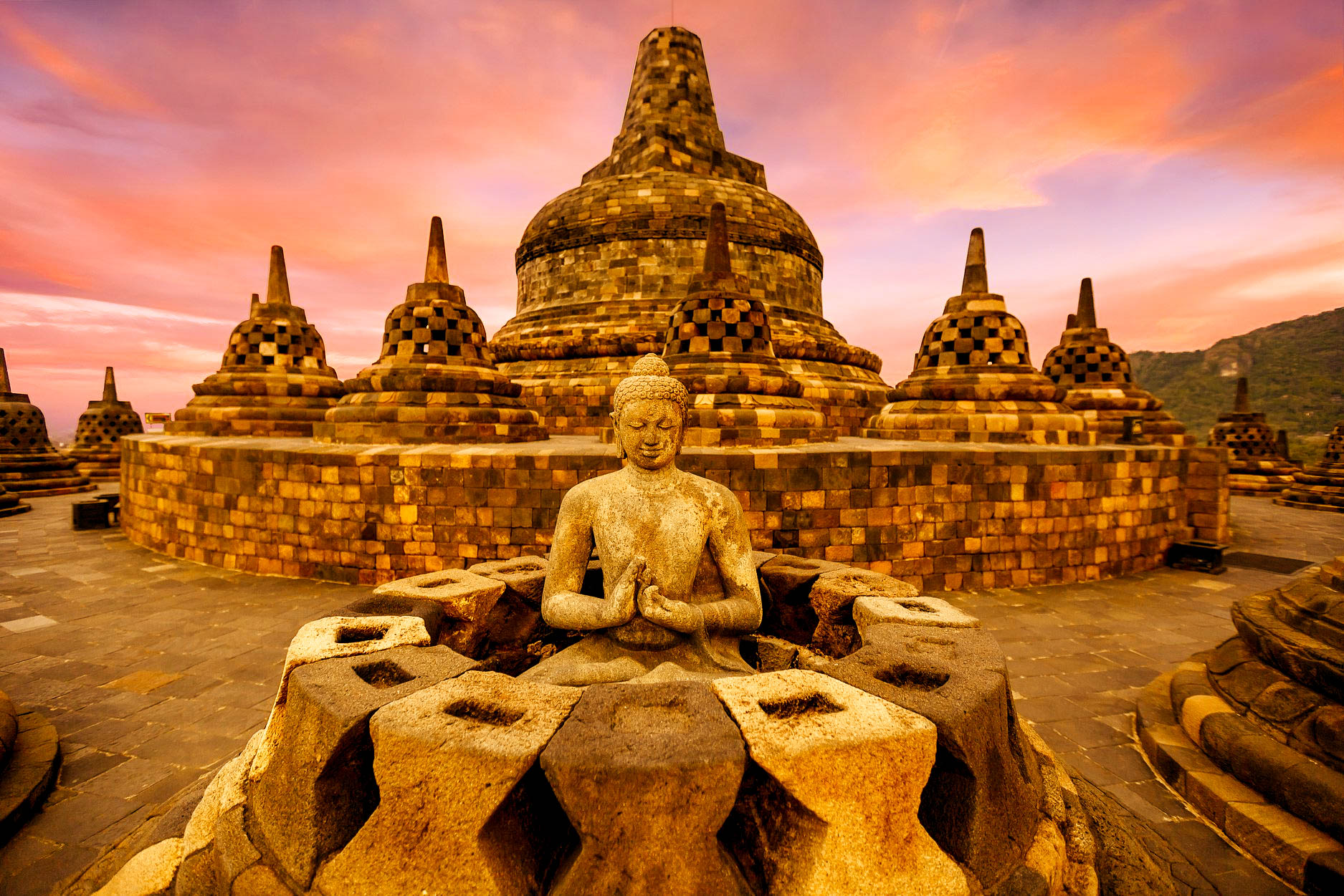 婆罗浮屠位于印尼爪哇岛日惹附近的中爪哇省,由160多万块石头于一座矮丘上筑成,是世界上最大的单一佛塔。