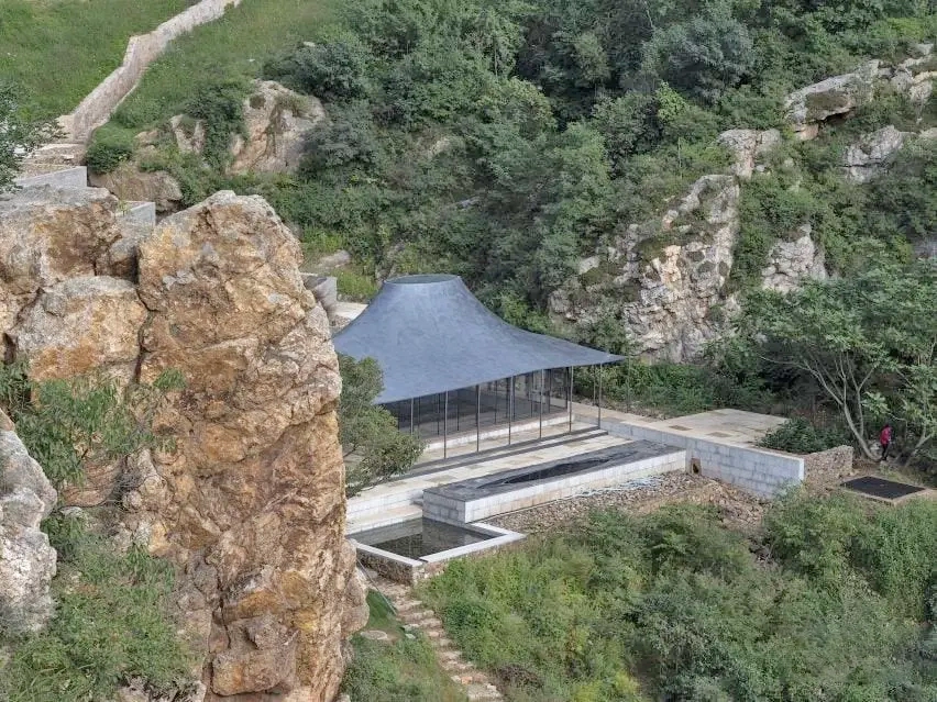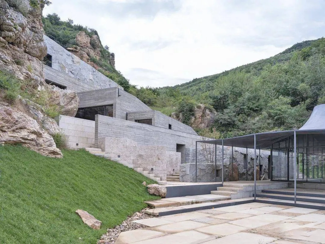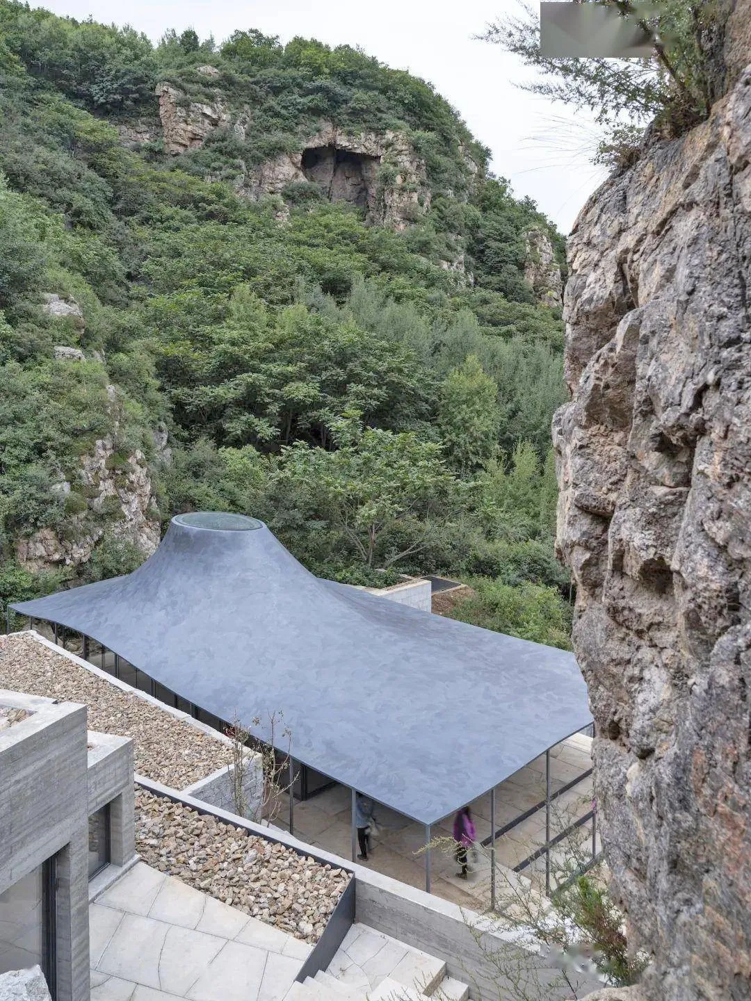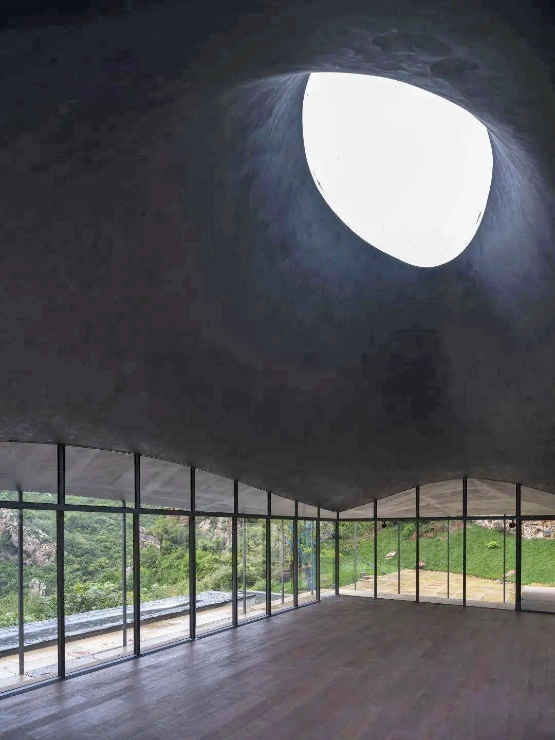 它的造型以汉字“舍”为象形,意思是一方庇护所。室内空间由四面全景落地玻璃窗相围,通透轻盈,与周边的山石崖壁浑然一体。