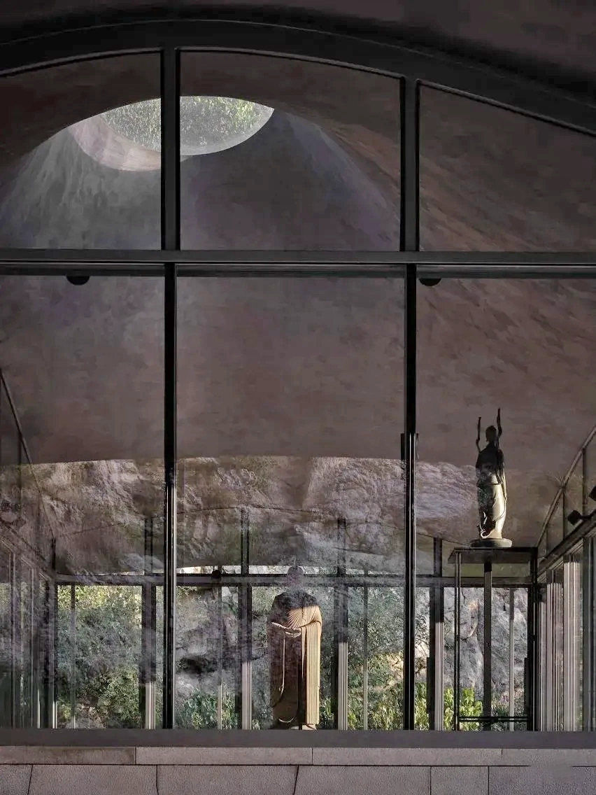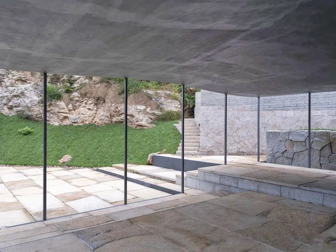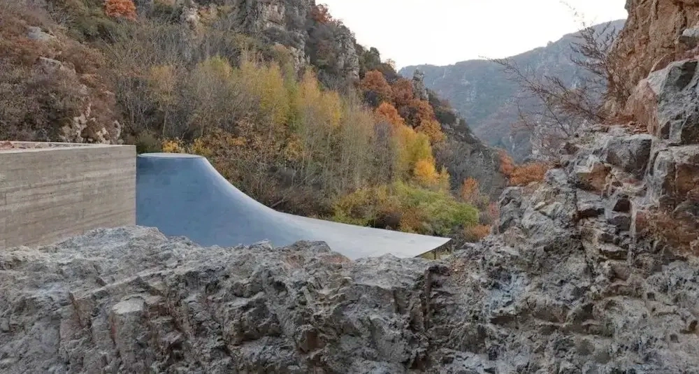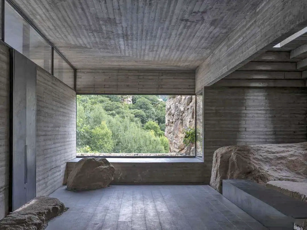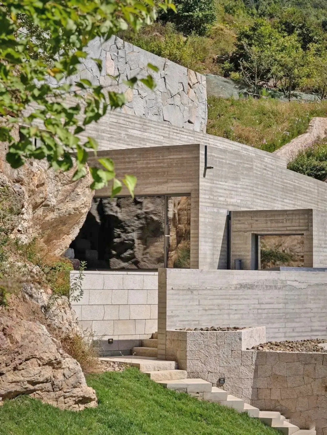 它的造型以汉字“舍”为象形,意思是一方庇护所。室内空间由四面全景落地玻璃窗相围,通透轻盈,与周边的山石崖壁浑然一体。