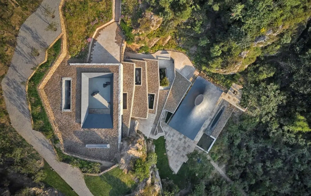 屋顶的开口刻画出了一个朝向天空的框景,从院内向远望去有远山、烽火台,有断崖峭壁,天际缓缓游弋的云彩为静默的构图添加了一分生动意蕴;从高处俯瞰,向内凹陷的延伸感更有一种强烈的吸引力,让人想探入其中相看内里究竟, 这种介于内外之间的互动引力丰富了自然景观与建筑构造间的对话。