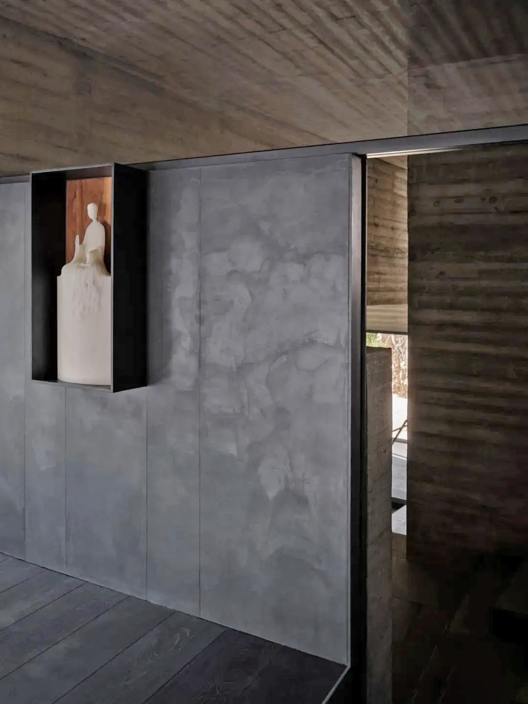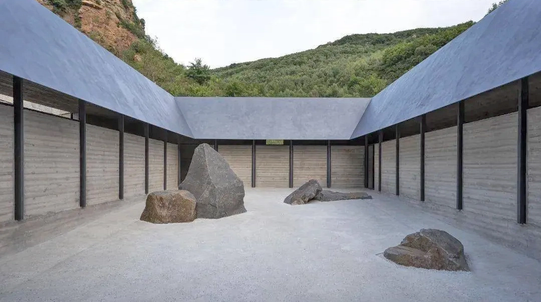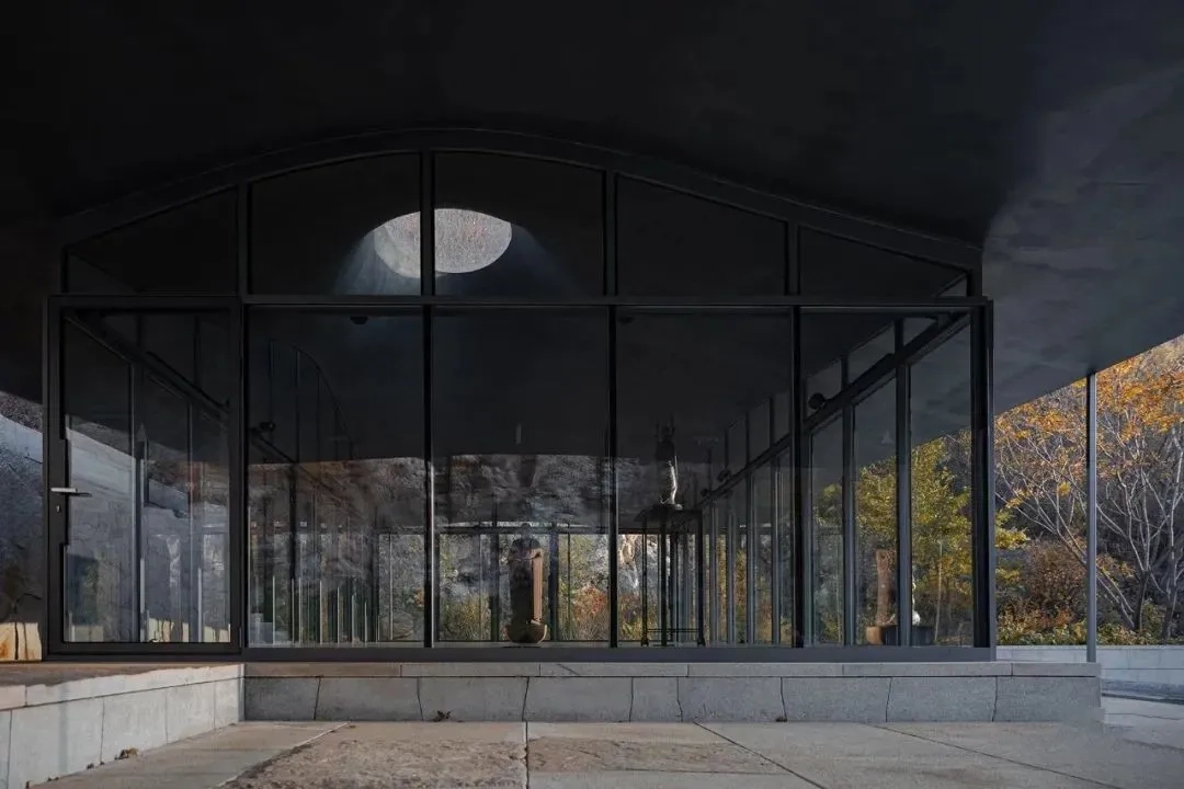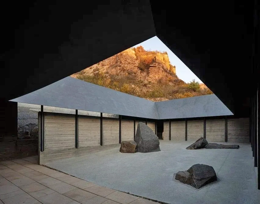 寺庙设计的路线自上而下,游客可以通过一条狭长的甬道进入位于项目顶点的“院”中,钢柱围合的院子一侧是佛堂,另一侧的墙上开了一个洞,犹如一幅画框,让窗户内外的古老长城和天然石像被永远定格住。