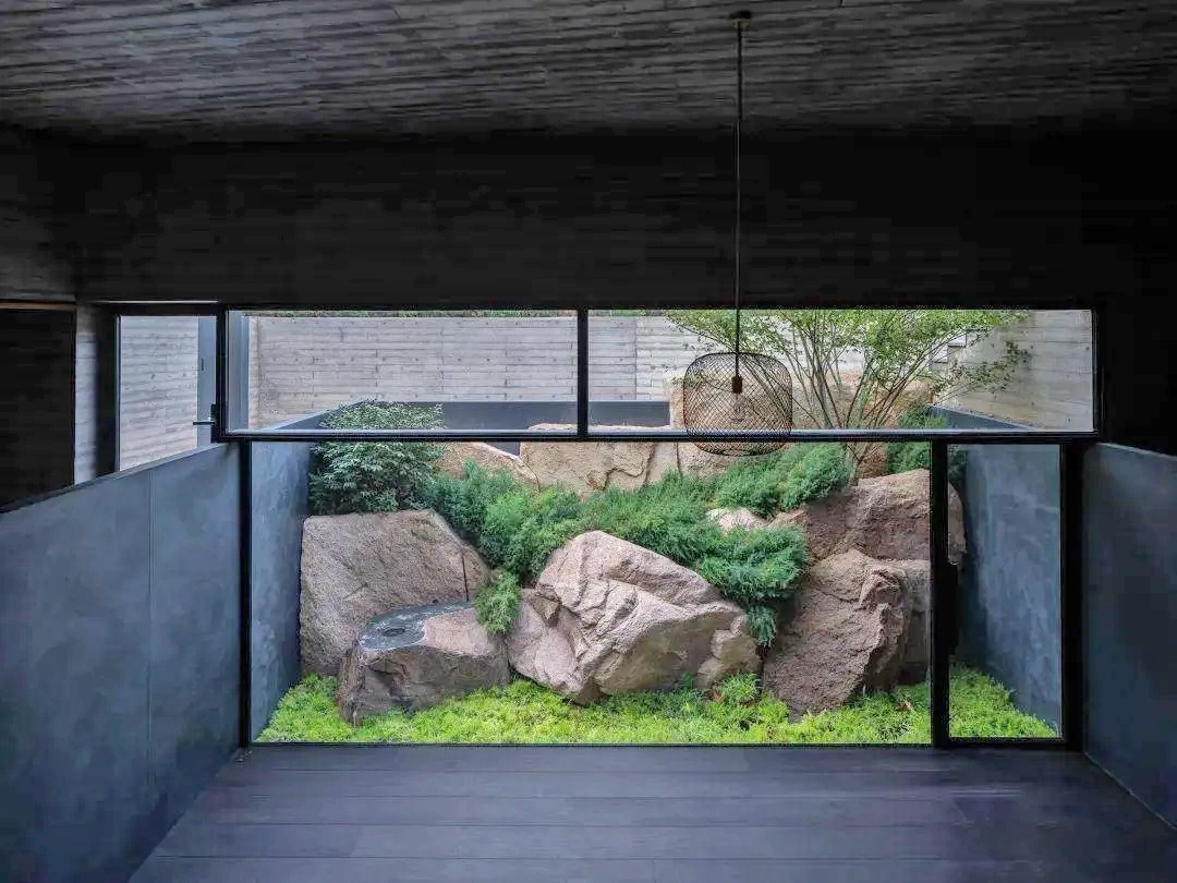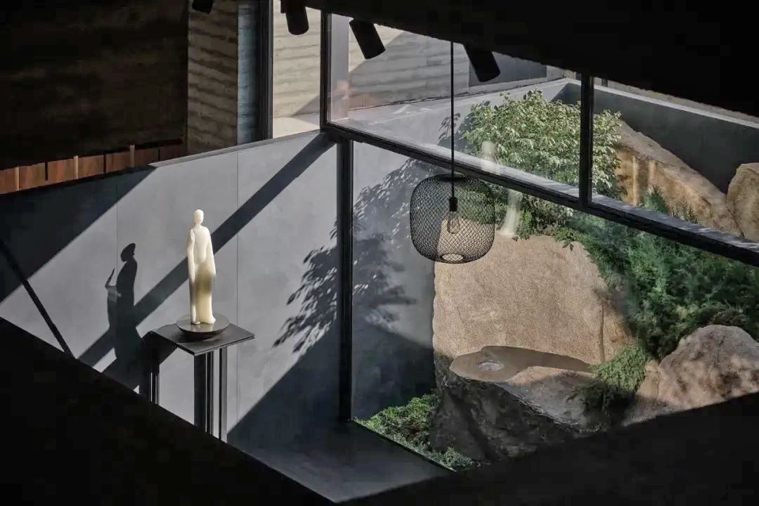 几块形态各异的山石散落点缀在上院中,这种“少即是多,无即是有,枯即是丰盛”的东方园林哲学让微缩式的景观呈现出无尽深意。