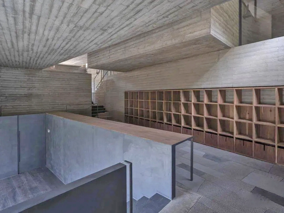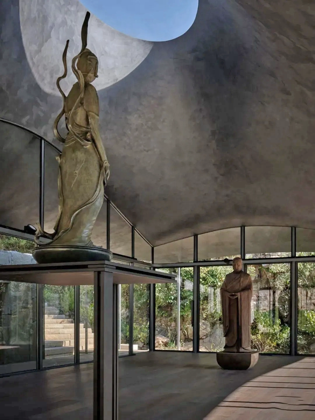 而最为有趣的设计在于,由于山体阶梯之间的落差太大,在衔接上下层时,设计师让阶梯空间半打开,形成了中间连接的“台”,内部设有冥想室、抄经室、用餐和读书室等众多功能, 既关照了原初的地形,也关照了建筑使用空间的需要。
