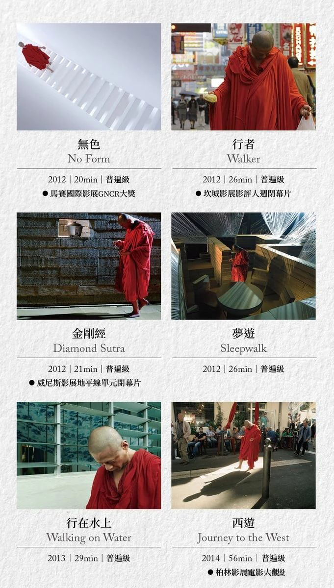 从2012年开始,这一走,他们从台北到香港、东京、巴黎、华盛顿,12年来慢慢走过8座城市、近10万公里的旅程,推出了《无色》、《行者》、《金刚经》、《梦游》、《行在水上》、《西游》、《无无眠》、《沙》、《何处》、《无所住》10部《行者》,其中的每一颗镜头、每一个步伐,都是与千年前的僧人遥相呼应。