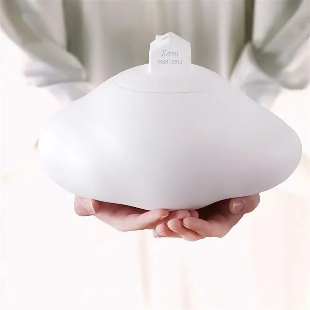 他将骨灰盒设计成了一片云朵的形状,在云朵的上方,印着逝者的名称和在世时间。整个线条柔和,周身洁白,较之惯常的惨淡更带有一层圣洁的意味,由此给予在世者以留恋与慰藉。