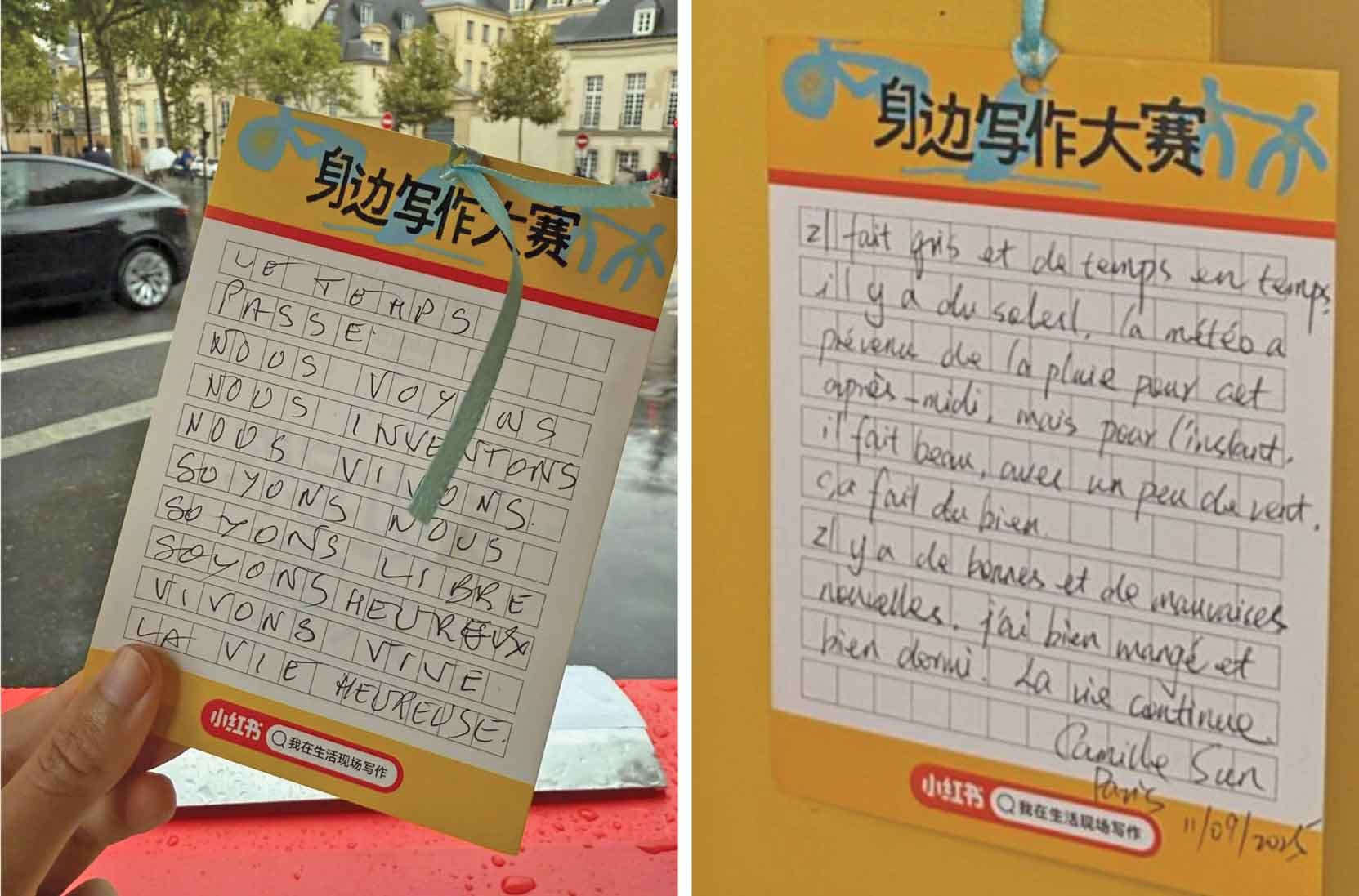 有法国人兴致勃勃地用中文写下句子,也有中国人认真地用法语构思。写作屋里,被提及最多的,是秋天、是巴黎、是异乡人心底的一点柔软思绪。