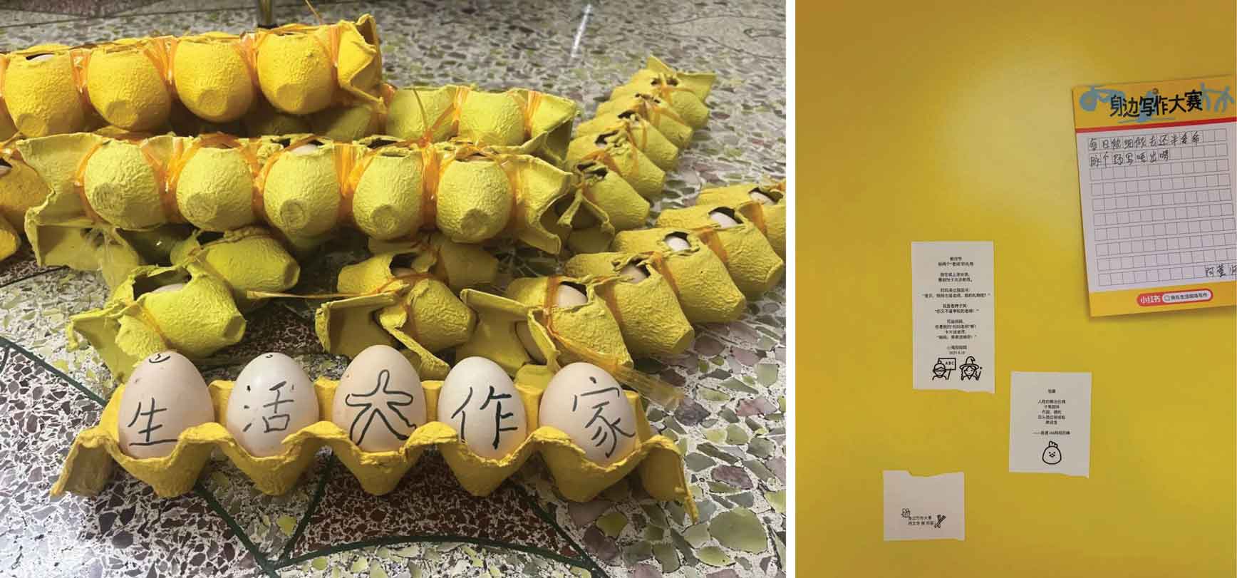 工作人员拿着喇叭在村里喊:“写作换鸡蛋!”