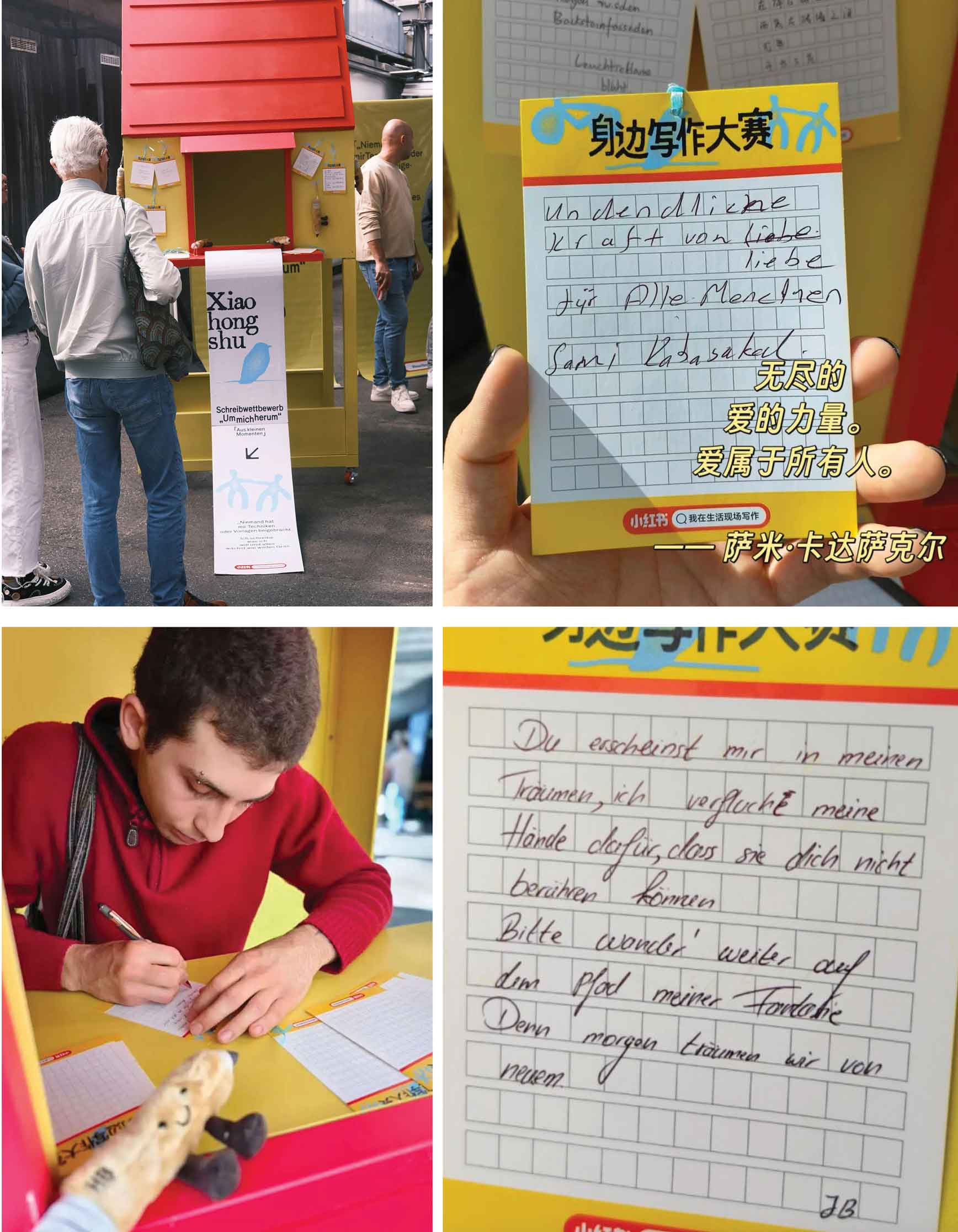 全场写作速度最快的一位诗人,是一位土耳其大叔,他看到信纸就径直走过去,没有围观,没有问询,流程熟练得像是每天都要来这么一回。他写下:“爱给所有人”(Liebe für alle)。