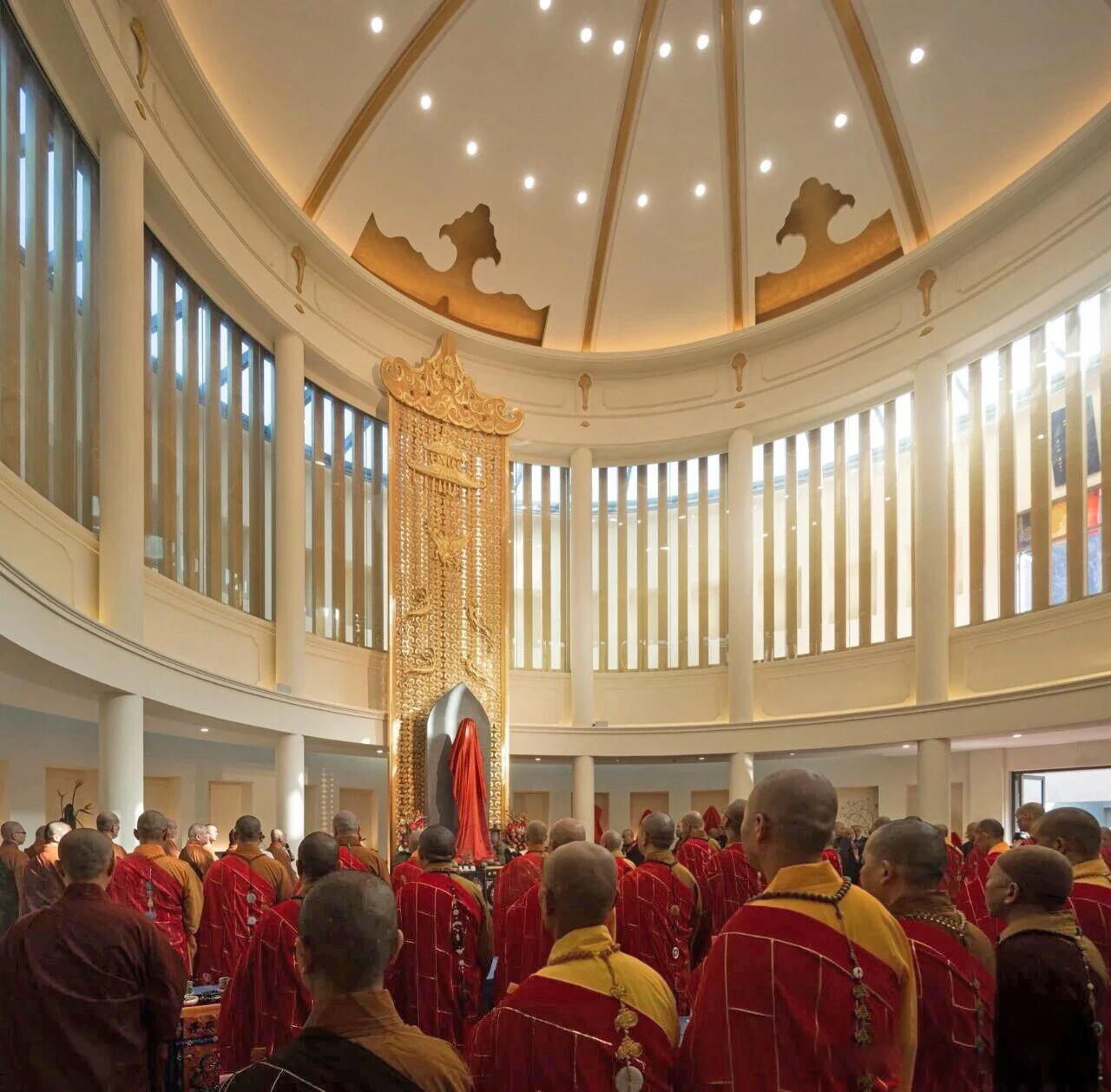 建筑外层是安置佛像的“千佛墙”,内层则打造出一个半透明的大雄宝殿空间,安放着一尊大型如来佛像,这里每日举行早晚课法式。