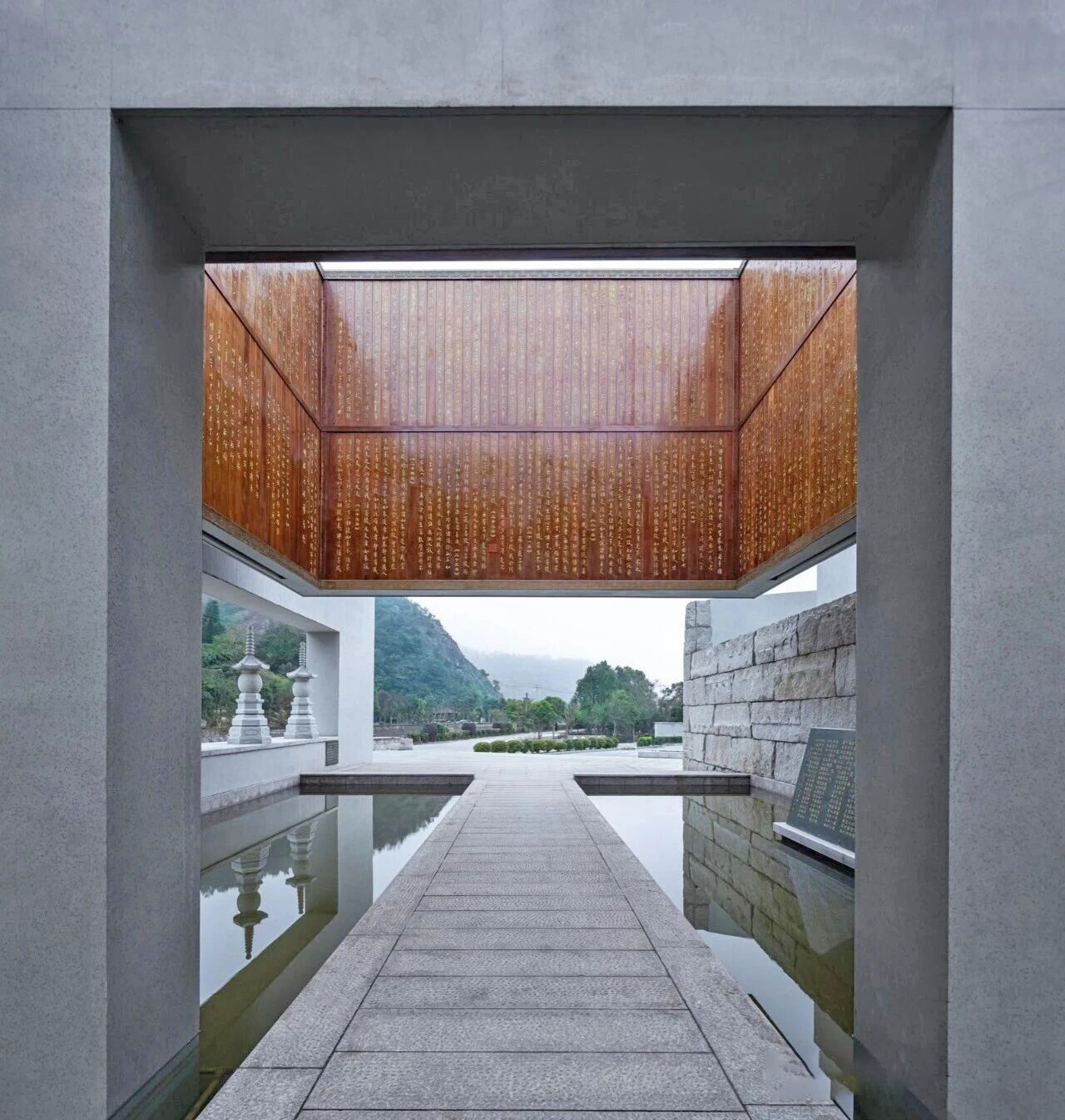 山门地面巧妙利用山泉,汇聚成一个放生池。门上悬着四块刻有《金刚经》文字的木板,如同现代艺术装置般漂浮在空中,共同围合出一个方正的集散空间。