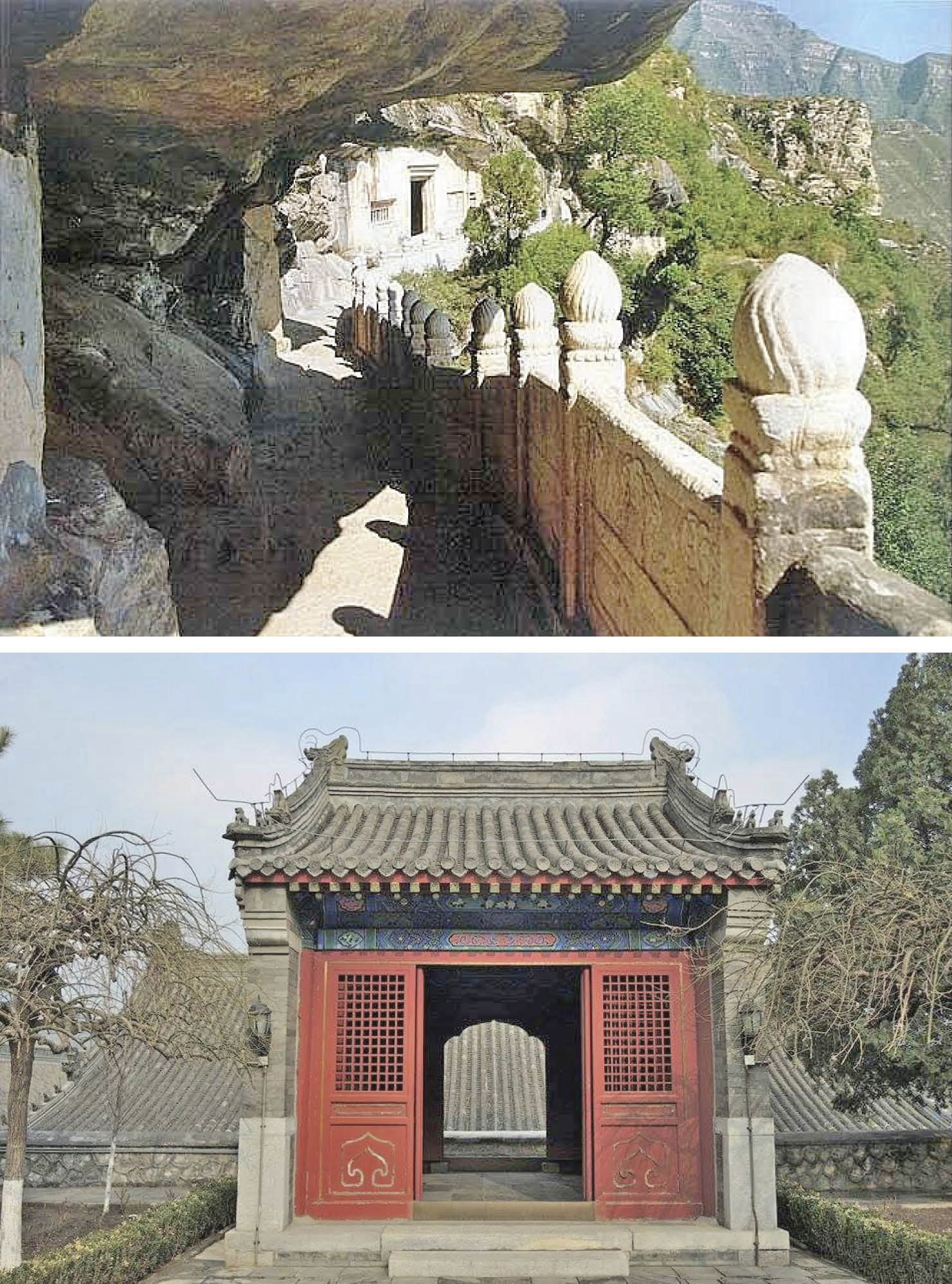 上:魏朝佛塔,就在黄杏林外,千余年历史仍斑驳记录于塔壁上。下:云居寺山门,乃书法大师赵朴初题字。