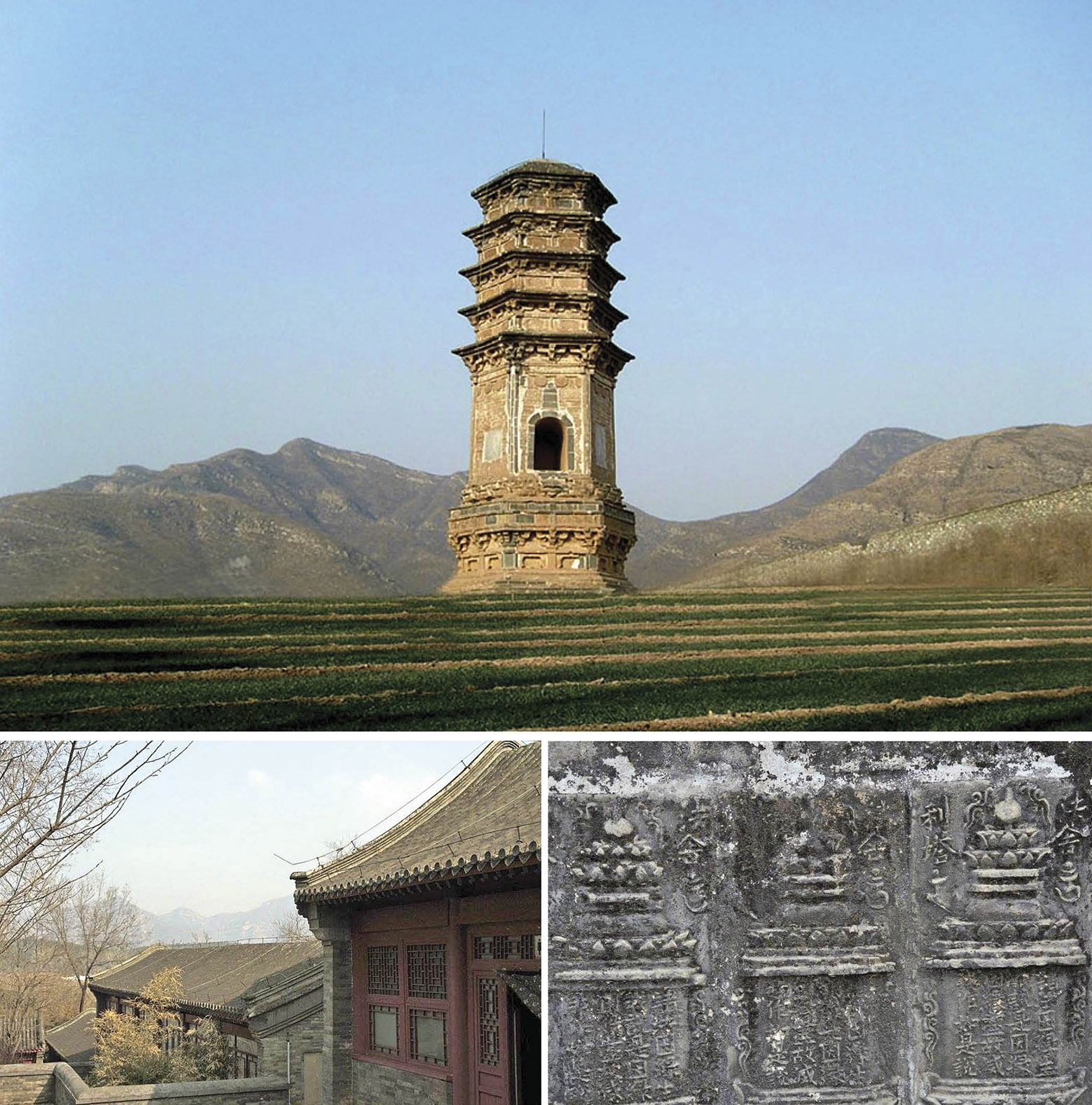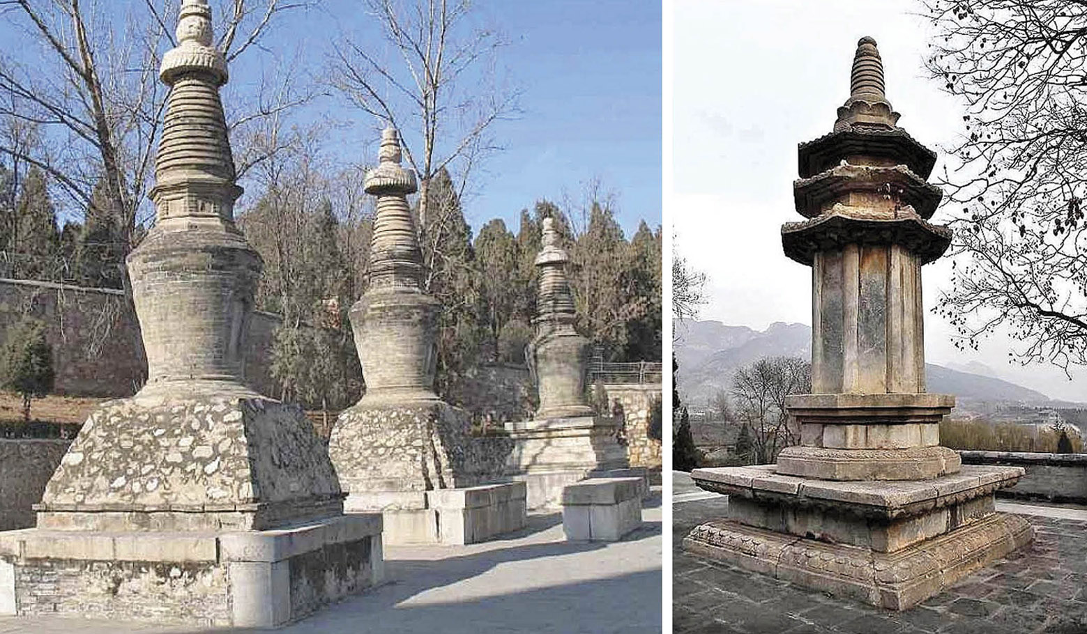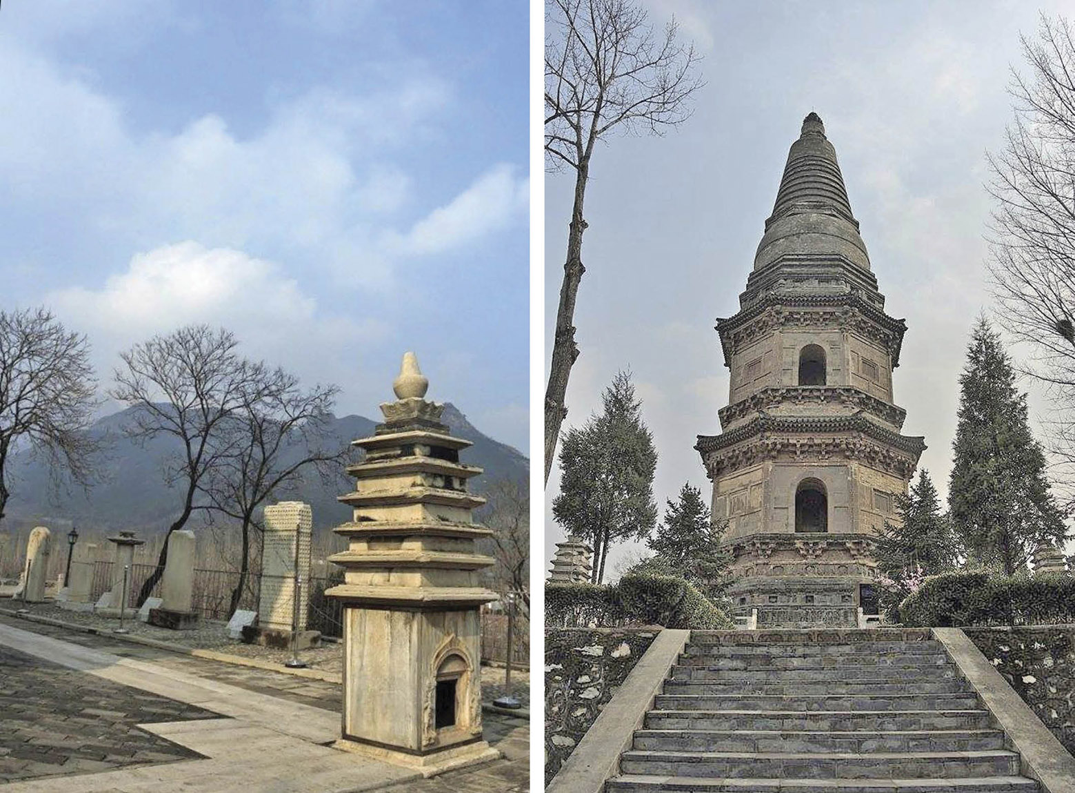 左:留下的唐代佛塔较小,为五重设计,塔壁上刻有经文。右:重新修建后,魏塔更显雄伟。