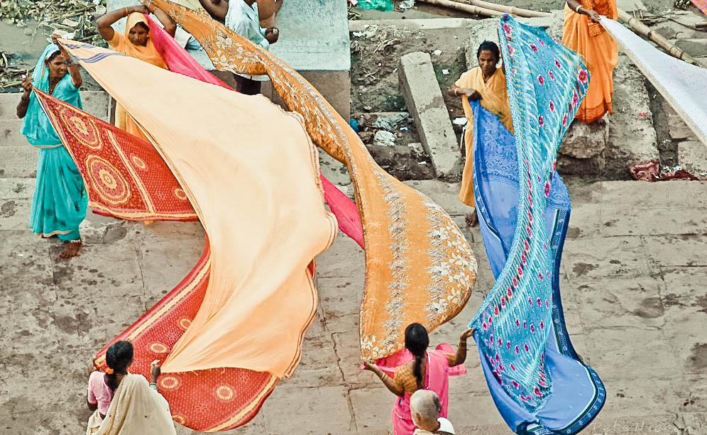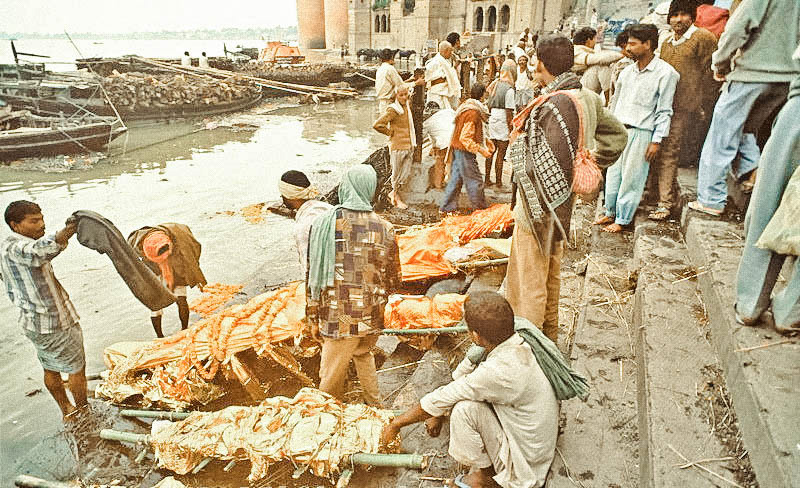 早上7点多钟,宿舍楼下的素食摊子开档了,我把肚子吃得特别饱,或许我真的需要一个饱胀的肚子来应付这一天里处处会冲击我精神思维的境况。河边的妇女早洗好大大幅的床单与纱丽,正铺在河边梯级上晒晾。剃头人也开工了,已经有不少虔诚的男兴都教徒在开始轮候。甚至,寺庙门前那些奇形怪状的苦行者,也纷纷由自己的小草席上站起来,在一天喧闹爆发之前先到河里清洗一下自己。狗儿在河边跑老跑去,没什么可以咬一口的,火化场的工人们还在筹备焚木,尸体还没到,还没开始。